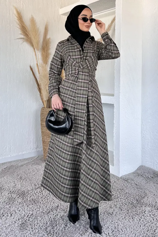 فستان ماكسي بتفاصيل ثنيات وأزرار أمامية وياقة ملفوفة