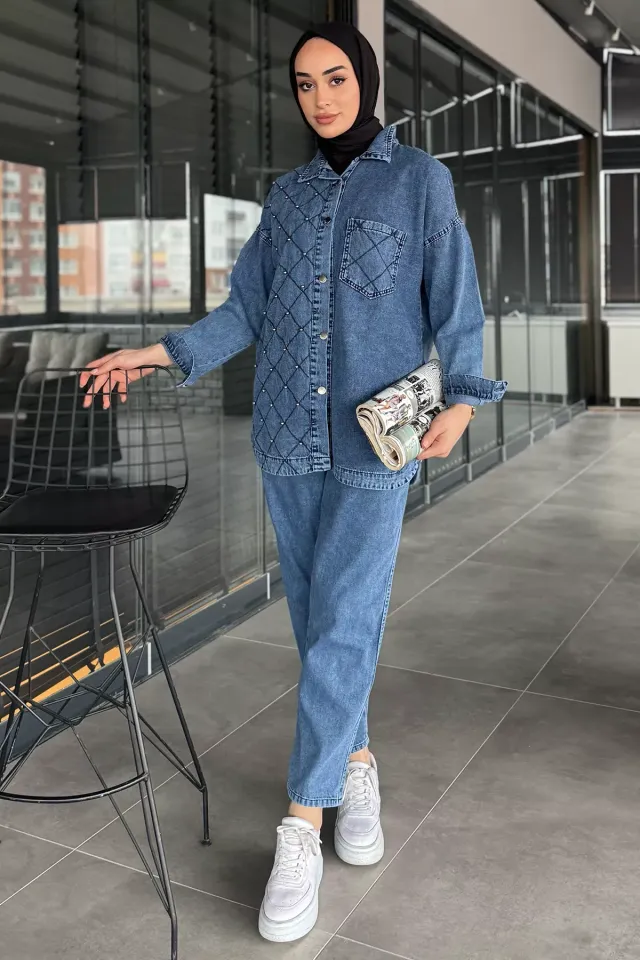 طقم مكوّن من قطعتين يشمل فيست بدون أكمام مزين بحزام وبروش، مع تنورة بياقة دائرية كلاسيكية. مثالي لإطلالة محتشمة أنيقة وعصرية.