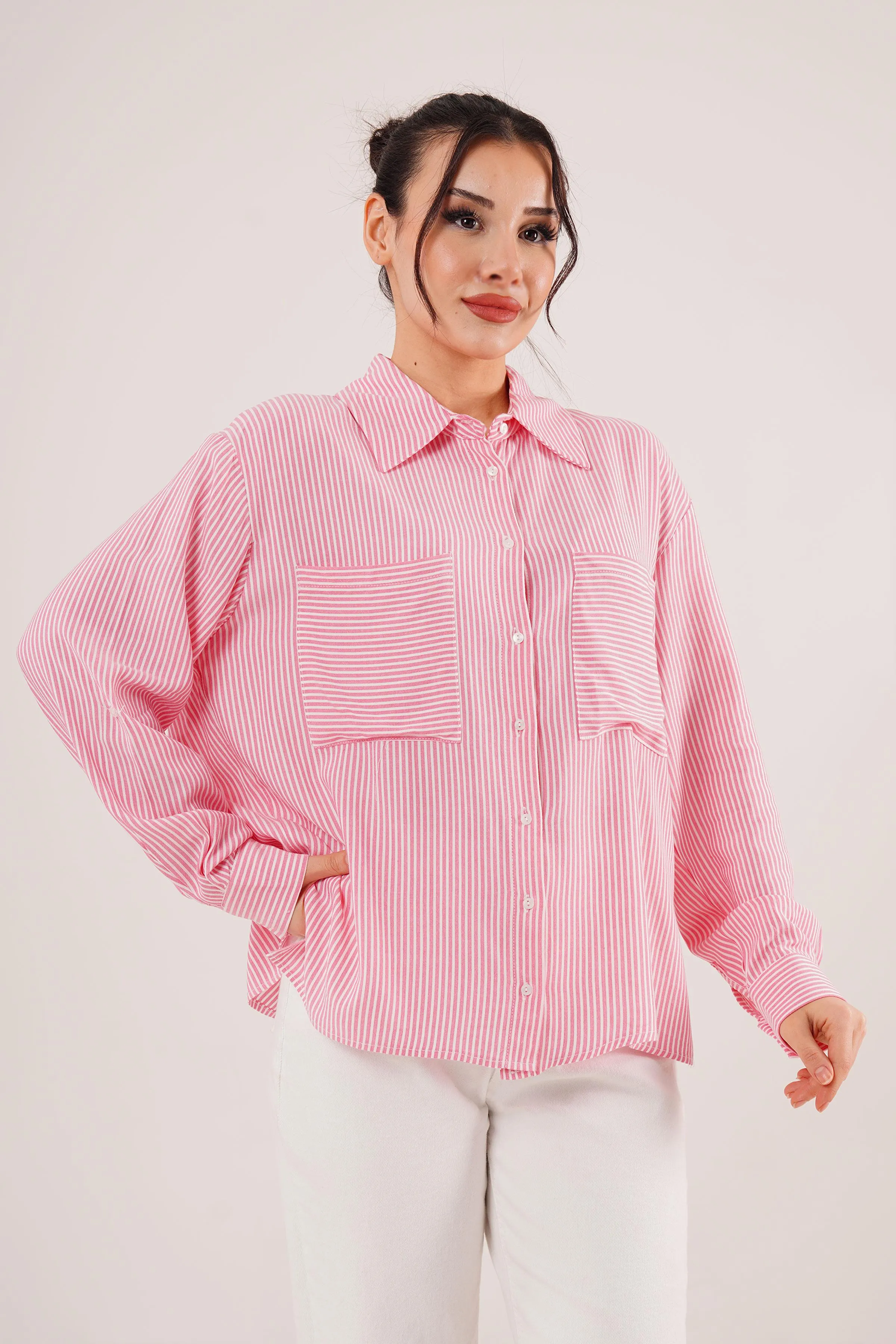 قميص نسائي كاجوال فضفاض بأكمام طويلة وتفاصيل مطوية أنيقة في الخلف، مصنوع من قماش بوليستر 100% لإطلالة عصرية ومريحة طوال اليوم.