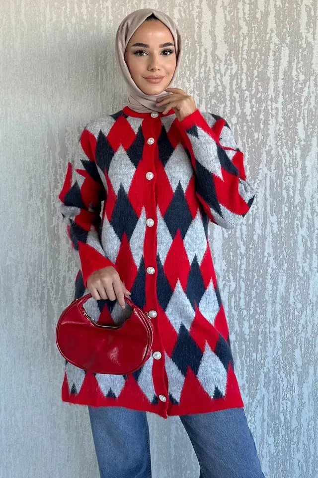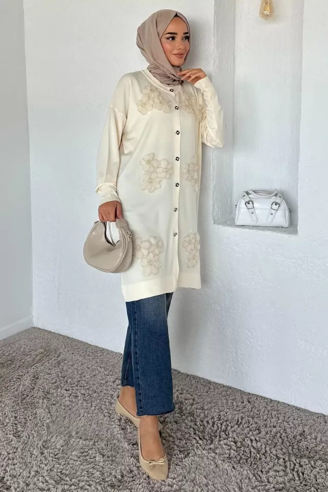 تونيك نسائي منقوش بياقة دائرية مزينة بأزرار وقصة مريحة، تصميم محتشم يجمع بين الراحة والأناقة للطلعات الكاجوال ومواسم الانتقال.