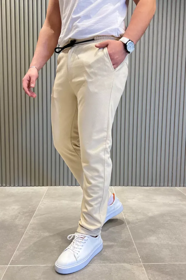 بنطال رجالي مخطط بقصّة مريحة مع خصر برباط، يجمع بين الراحة والمرونة. مصنوع من 85% بوليستر و15% لايكرا. قابل للغسل في الغسالة على درجة حرارة 30 درجة مئوية.