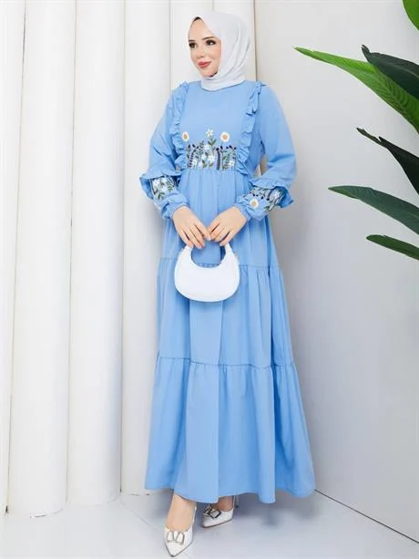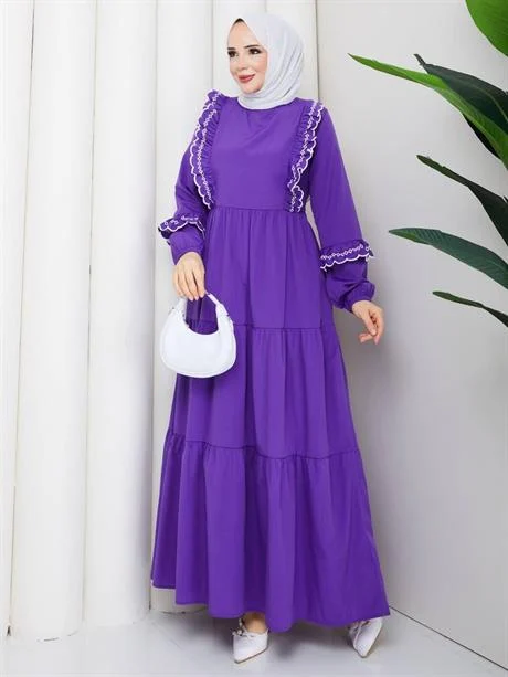 فستان ماكسي منقوش بأكمام طويلة مصنوع من قماش فيسكوز ناعم، مزود بحزام خصر يبرز القوام. تصميم محتشم ومريح مثالي لأناقة يومية بسيطة.