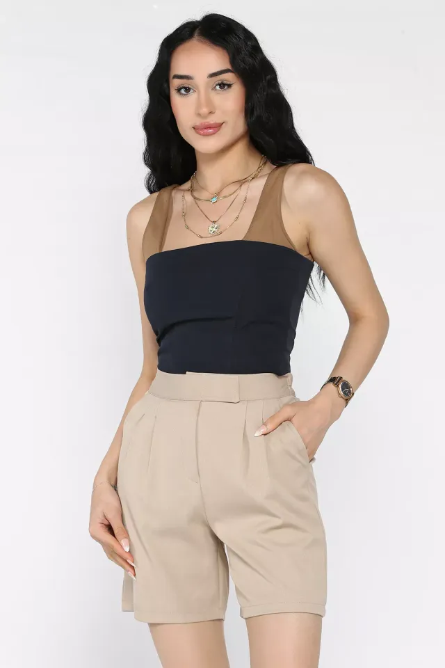 خصر مجمع مع قصة بكسرات تمنح الشورت مظهرًا ناعمًا. مناسب للارتداء الخفيف والحركة اليومية.