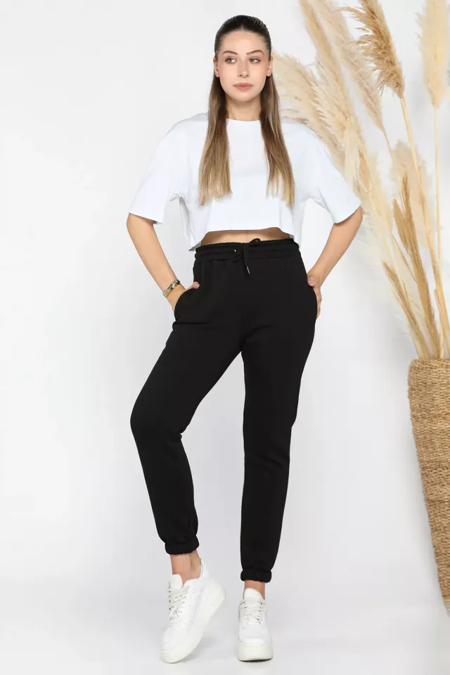 بنطلون رياضي نسائي واسع الساق بشريط جانبي وخصر مطاطي من قماش ناعم. مثالي للإطلالات الرياضية الكاجوال.
