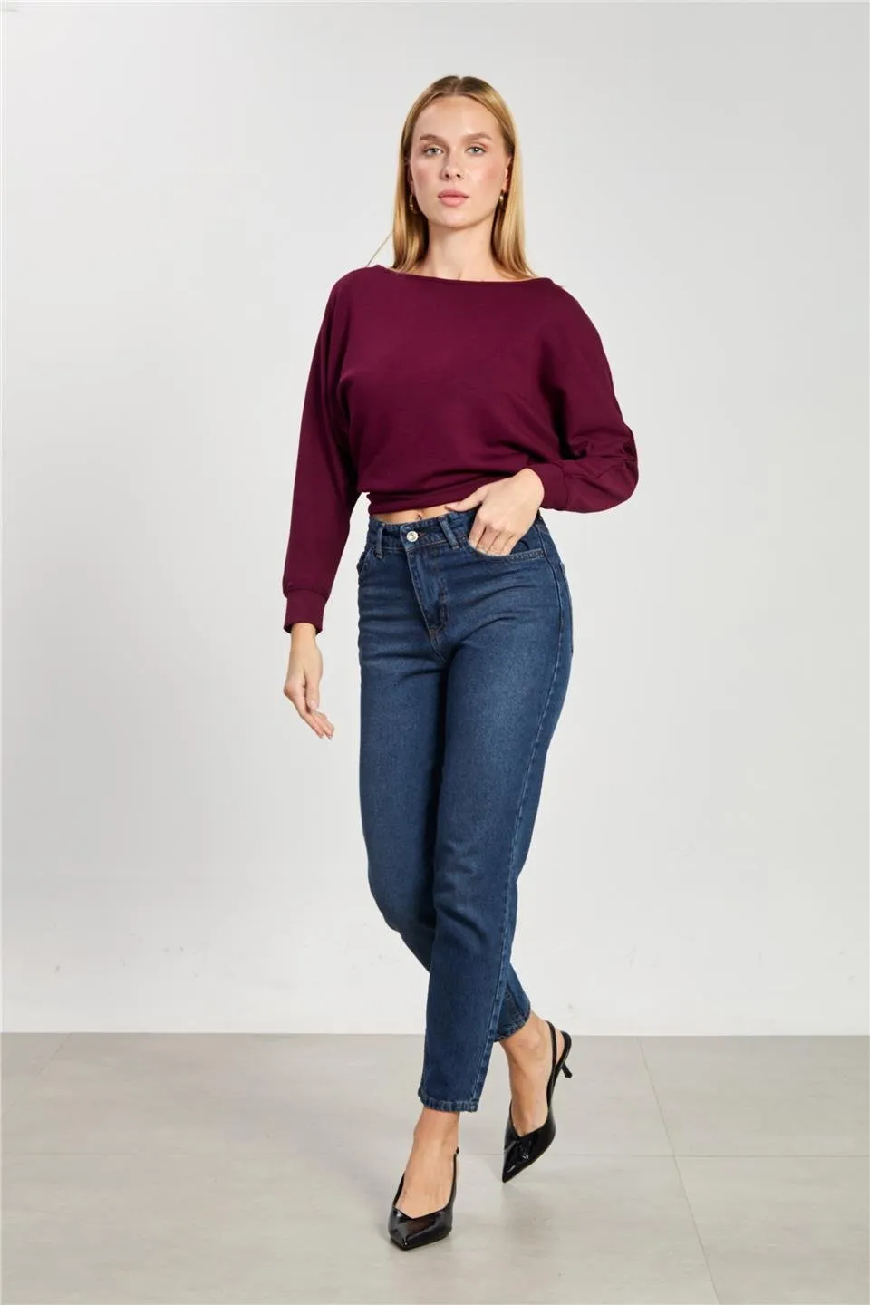 بنطلون جينز بقصة بالون واسعة الساق وقصة مستقيمة مع تأثير غسيل باهت