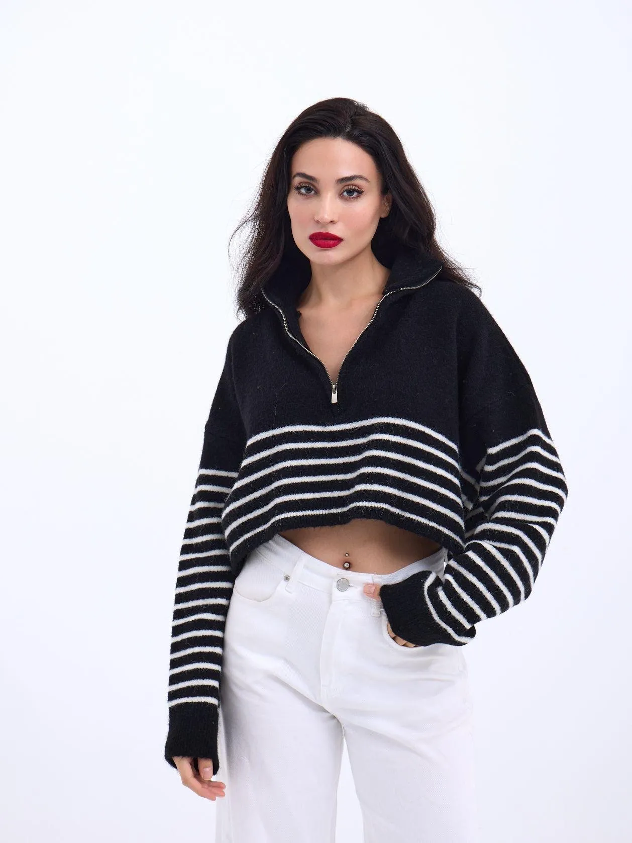 بودي قصير مزين بحجارة بياقة مستديرة مع تصميم كتف منخفض. تصميم ضيق ملاصق للجسم مثالي للاطلالات الصيفية اليومية.