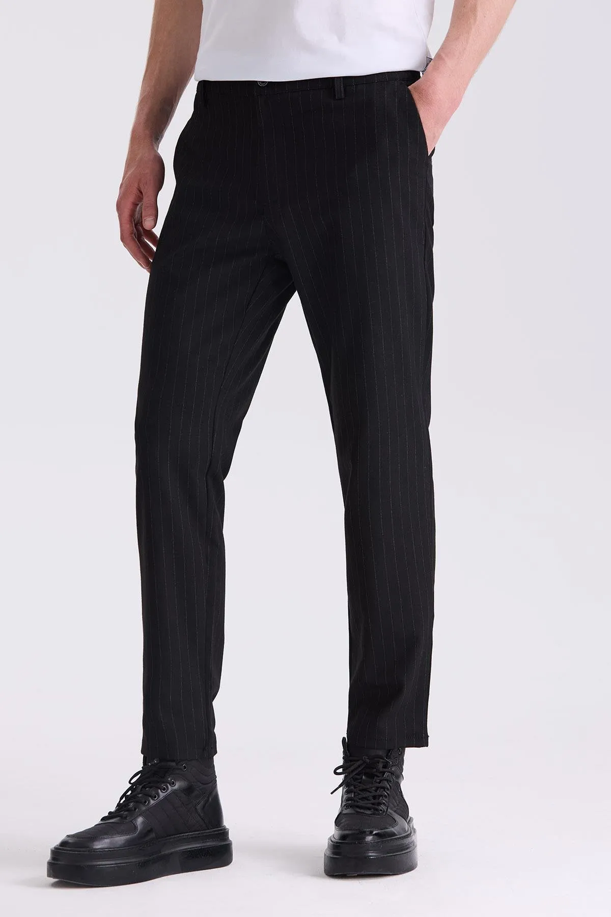 بنطلون رجالي بقصّة مستقيمة وخصر مرن، يجمع بين الأناقة الكلاسيكية والراحة المرنة. مصنوع من 95% قطن و5% إيلاستين. قابل للغسل على درجة حرارة 40 درجة مئوية، مثالي للارتداء اليومي.