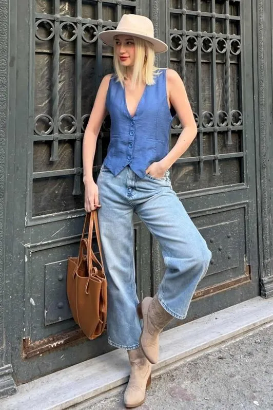 فيست تريكو بأربطة أمامية وتفصيل كشاكش ولمسات مخرمة بدون أكمام لإطلالة عيد وصيف عصرية