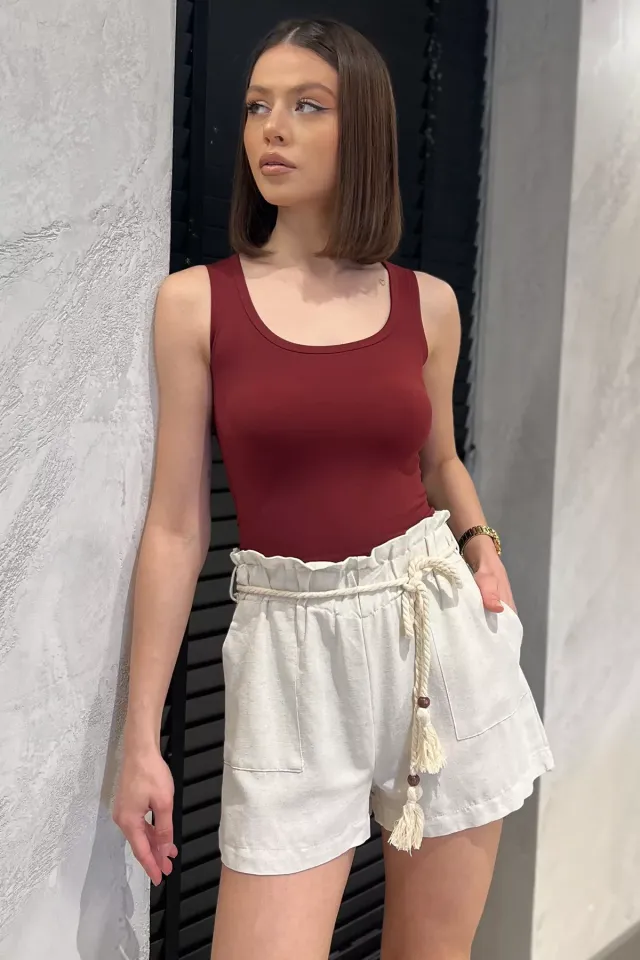 شورت كتان مزوّد بحزام عريض وخصر مطاطي يثبت بشكل مريح. مثالي للإطلالات الكاجوال اليومية للنساء.