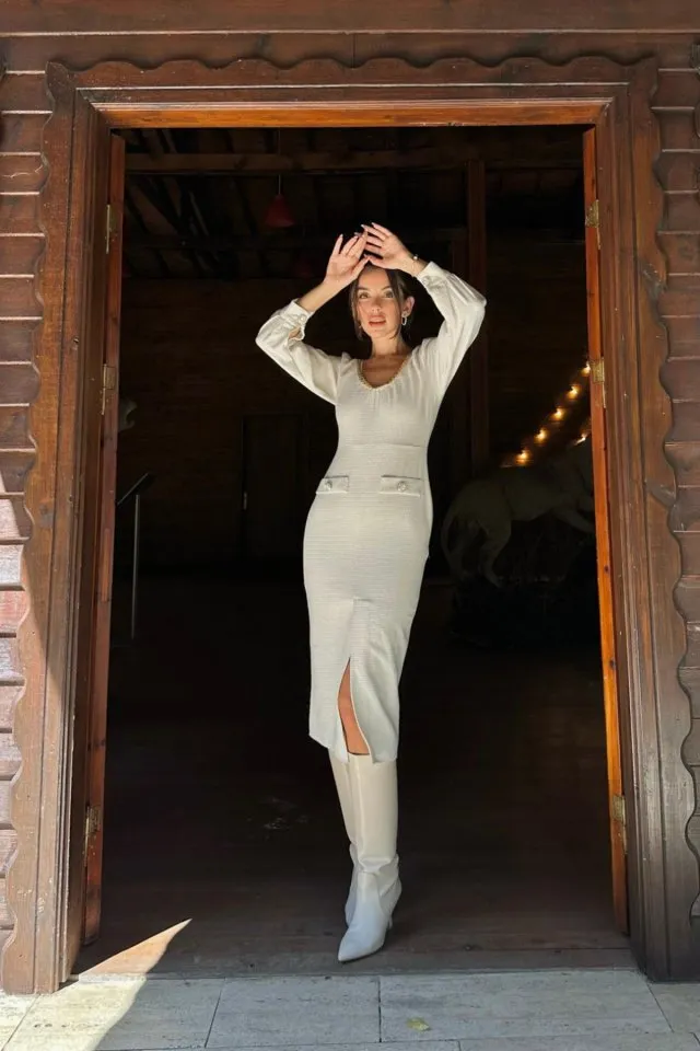 فستان ميدي بياقة هالتر وتنورة بكسرات بحمالات رفيعة - Beyond Store