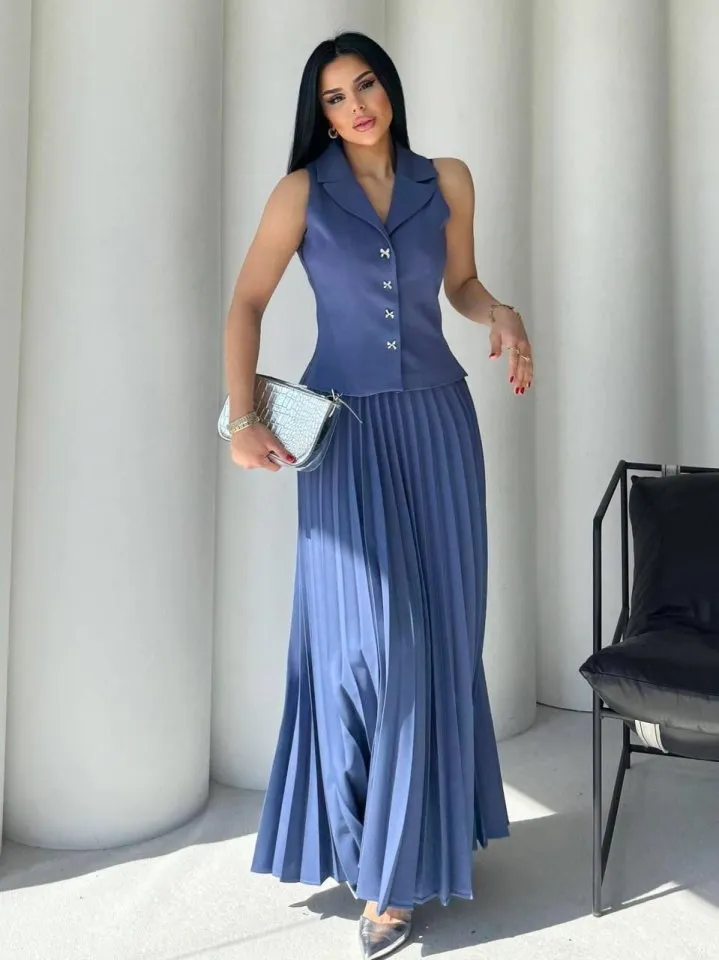 طقم مخطط أنيق مع فيست طويل مزدوج الصدر وتنورة متناسقة. إطلالة راقية وأنيقة، مثالية للإطلالات الرسمية أو اليومية الأنيقة.