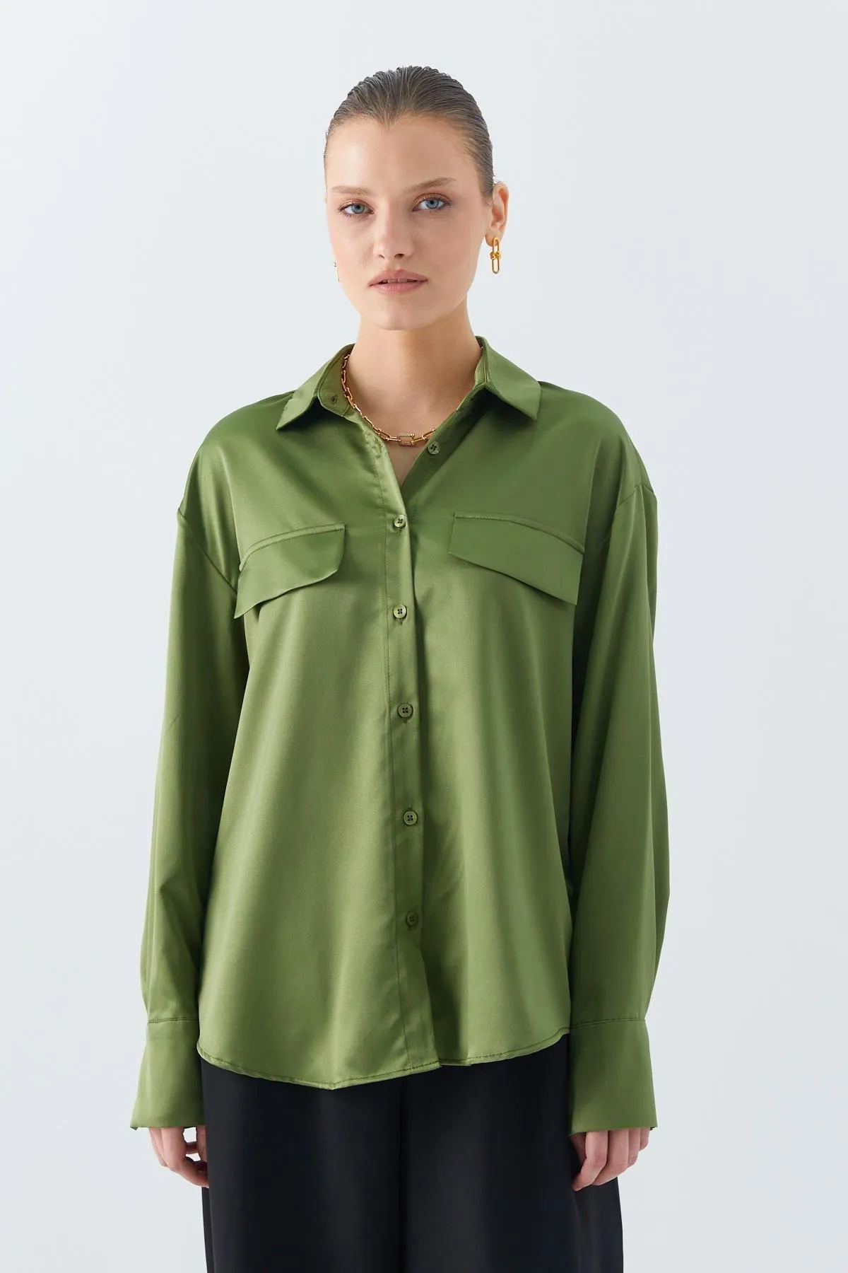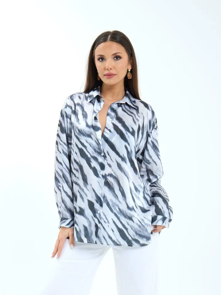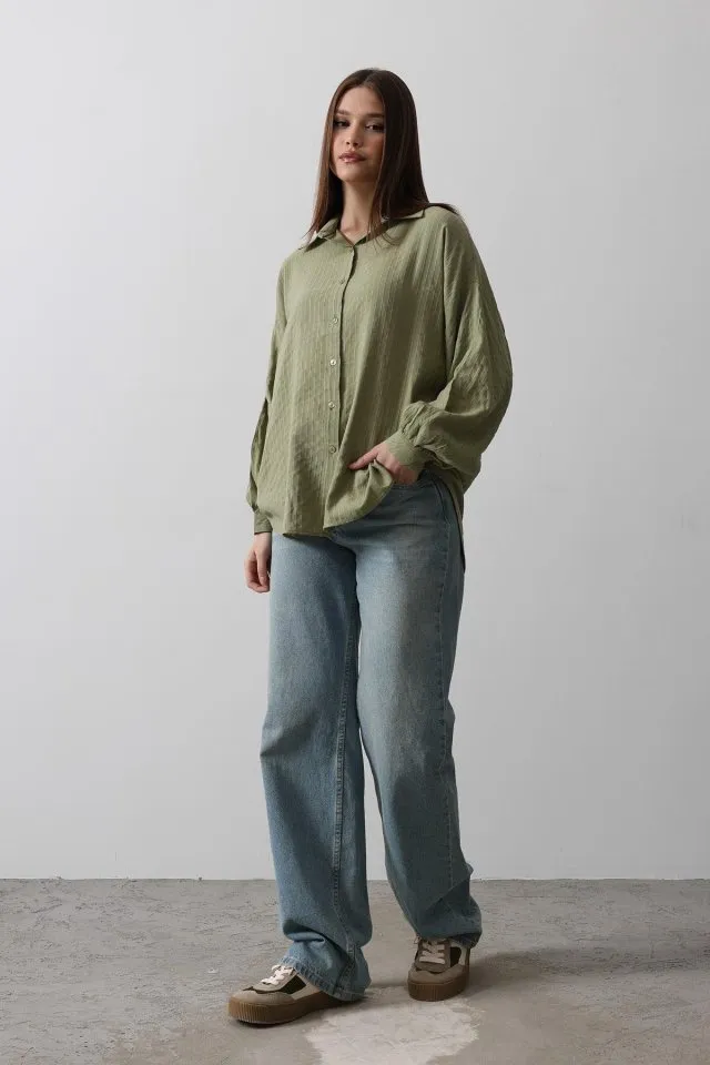 يتميز هذا القميص النسائي بتصميم كتف منسدل مريح مع إغلاق بأزرار، حيث يجمع بين الراحة غير الرسمية والأسلوب الكلاسيكي.