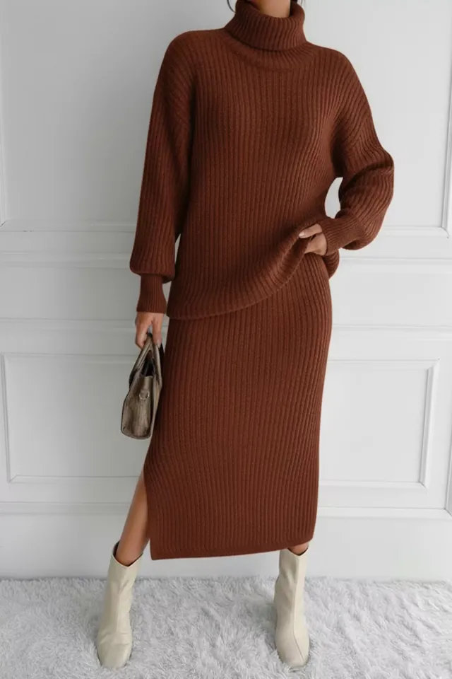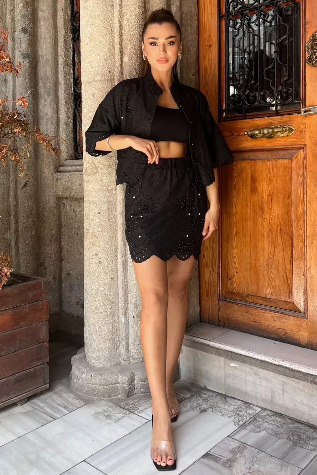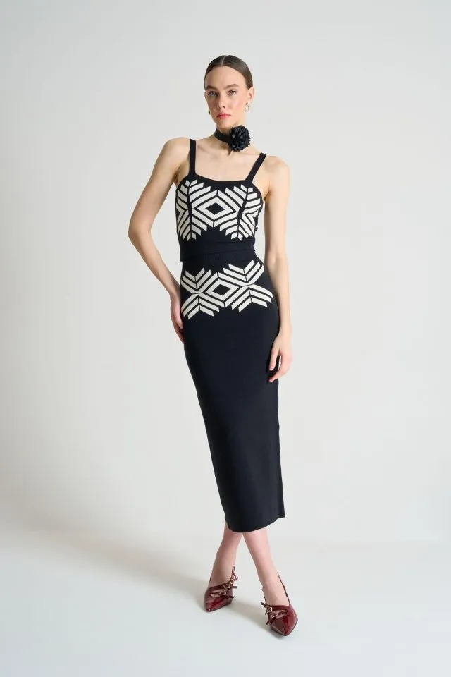 طقم توب قصير بدون أكمام بتفاصيل فيونكة وتنورة بشق. أنثوي وأنيقة، مثالي لإطلالات صيفية أنيقة.