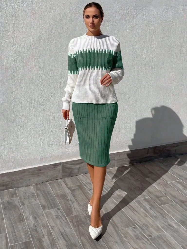 طقم قميص مضلع بأكمام طويلة وتنورة طويلة متناسقة. بسيط وأنيق، مثالي للارتداء اليومي المريح أو المكتبي.