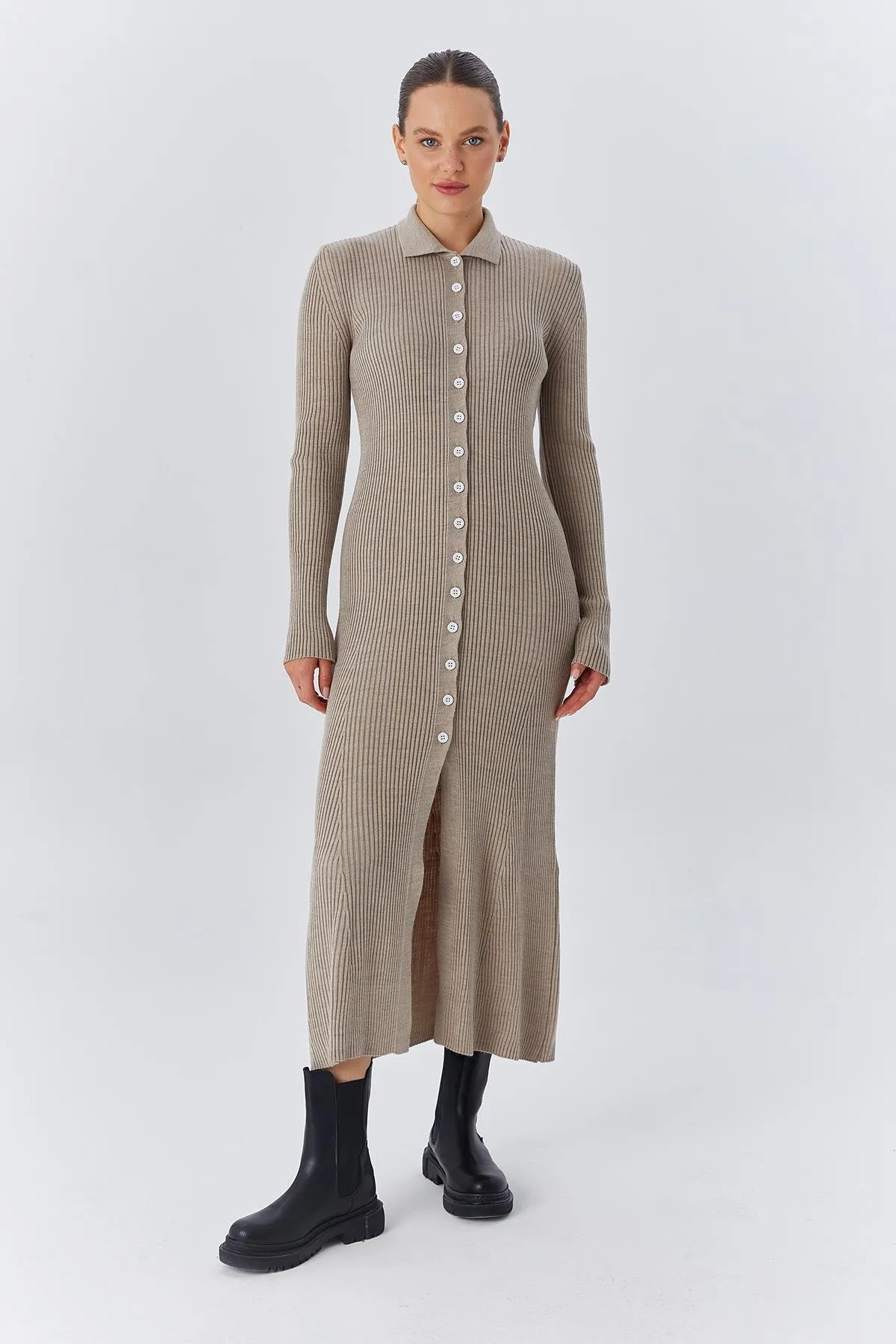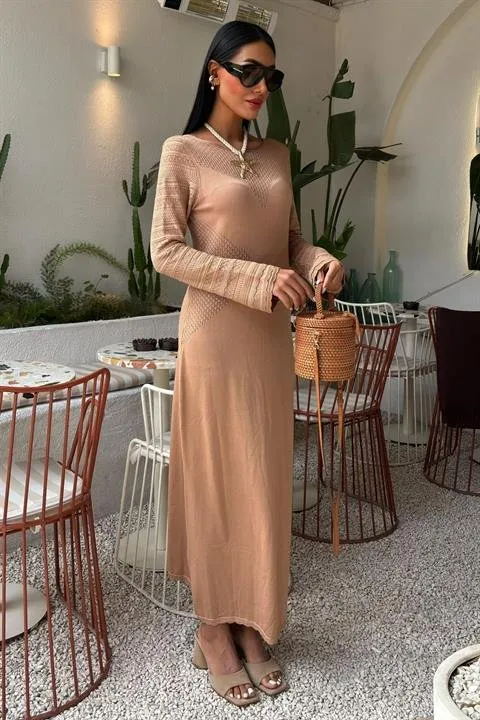 فستان ماكسي مضلع باكمام كلوش وياقة دائرية وحزام خصر قابل للتعديل، بتفصيل مريح وانسيابي مزين بكسرات خفيفة لإطلالة صيفية عملية.