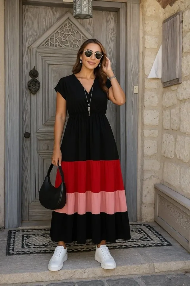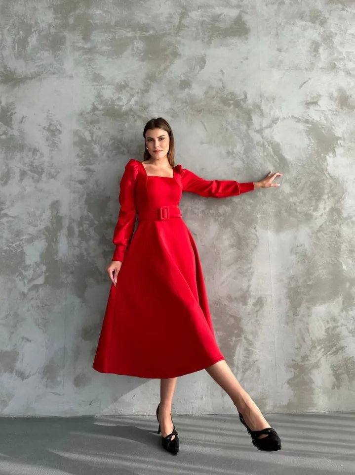 فستان ميدي مخمل بأكمام طويلة وتصميم متقاطع من الأمام مع شق جانبي، بقصة ناعمة وأنيقة لسهرات عيد الصيف.