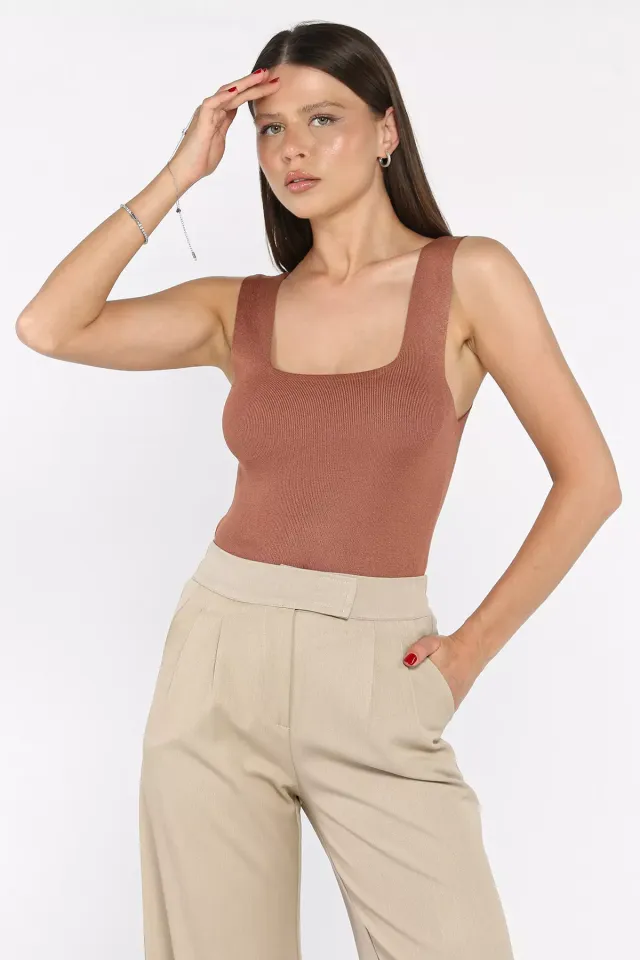 بلوزة بدون أكمام بياقة دائرية وتفصيلة فتحة مزودة بربطة. خيار صيفي يلفت النظر في التنسيقات اليومية.