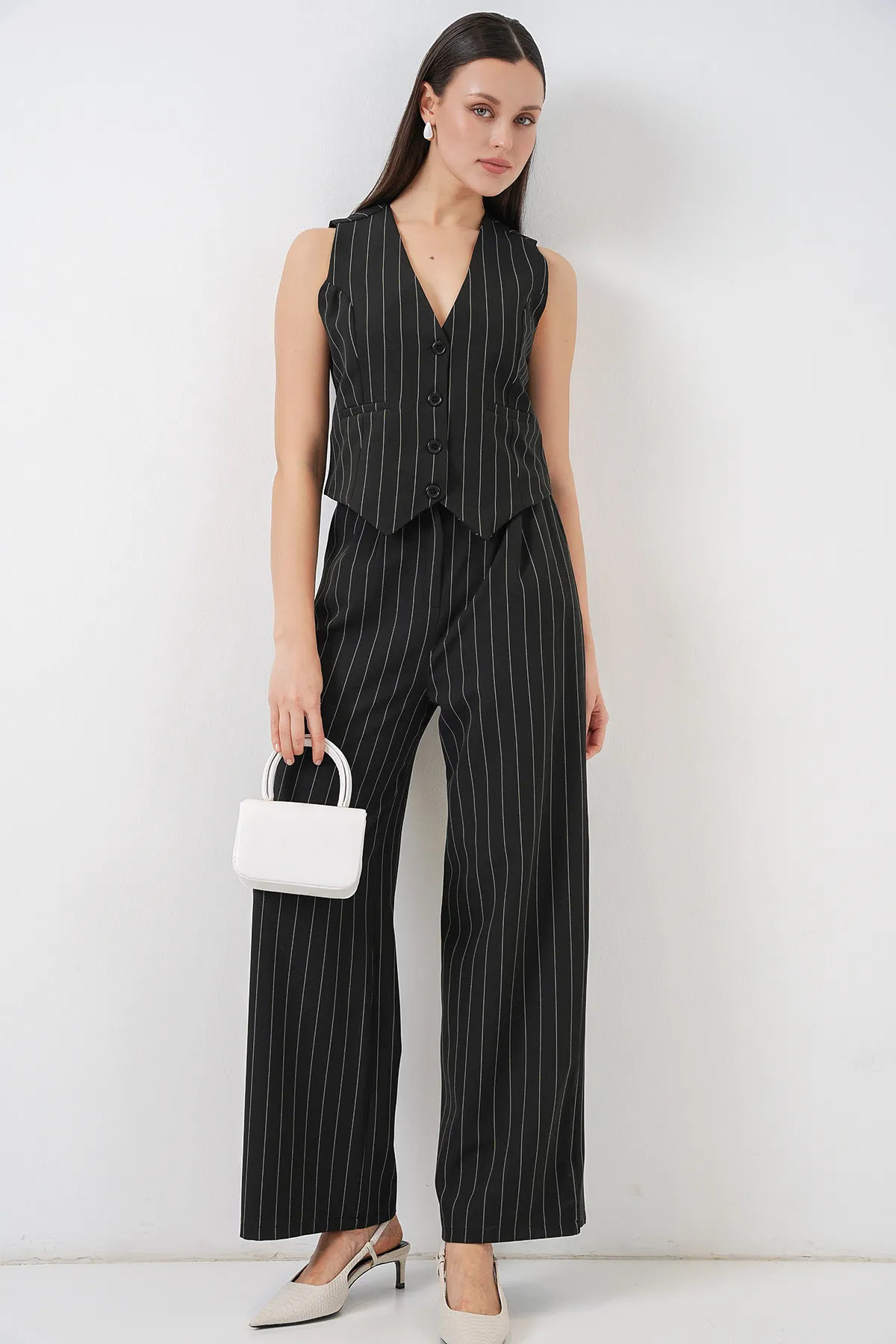 طقم نسائي بأكمام طويلة وكتف منسدل مع قميص وبنطلون مخطط يمنحك إطلالة كاجوال مريحة وعصرية، مثالي للدوام أو الطلعات اليومية.