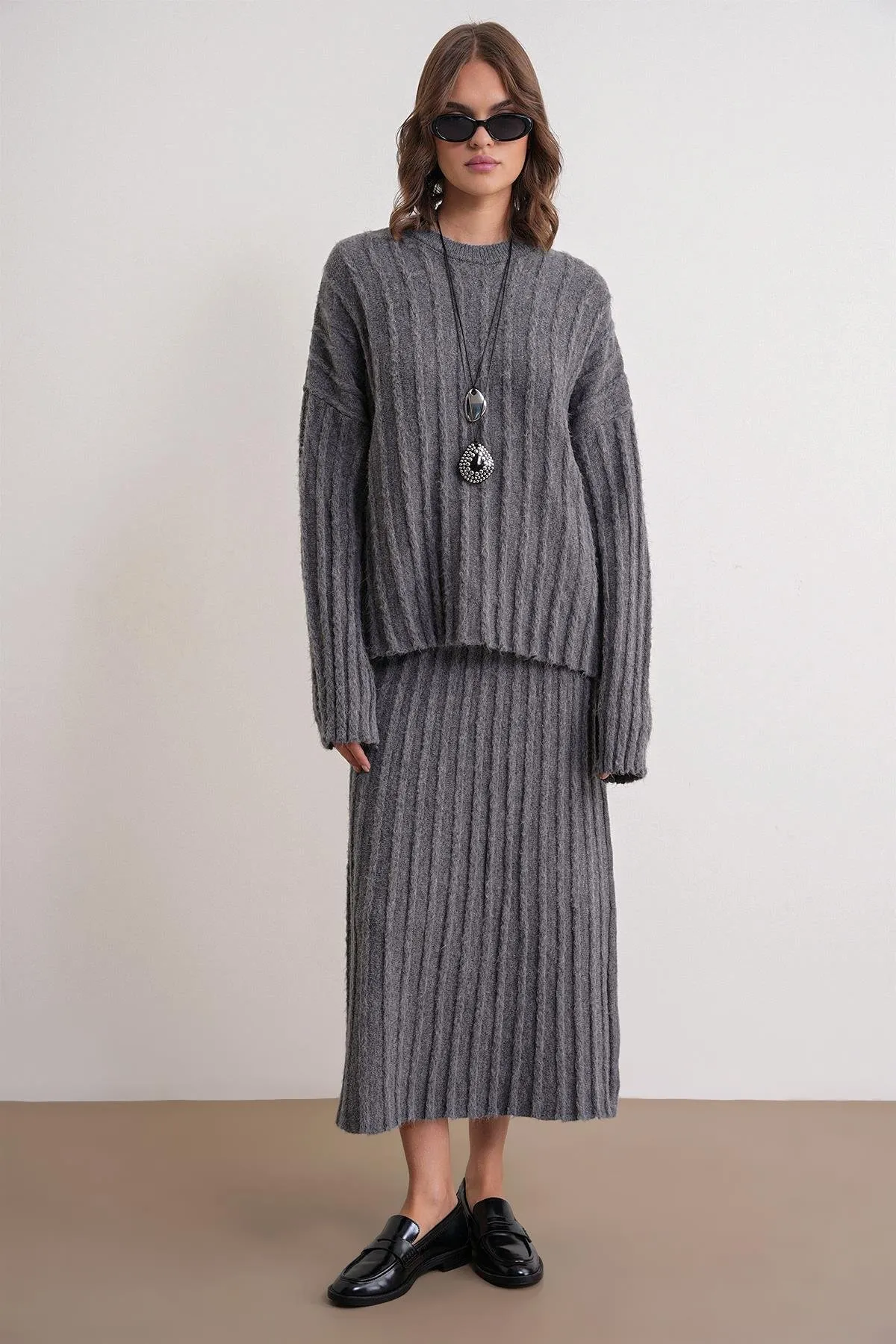 طقم تنورة بأزرار أمامية و تفاصيل سلسلة للنساء