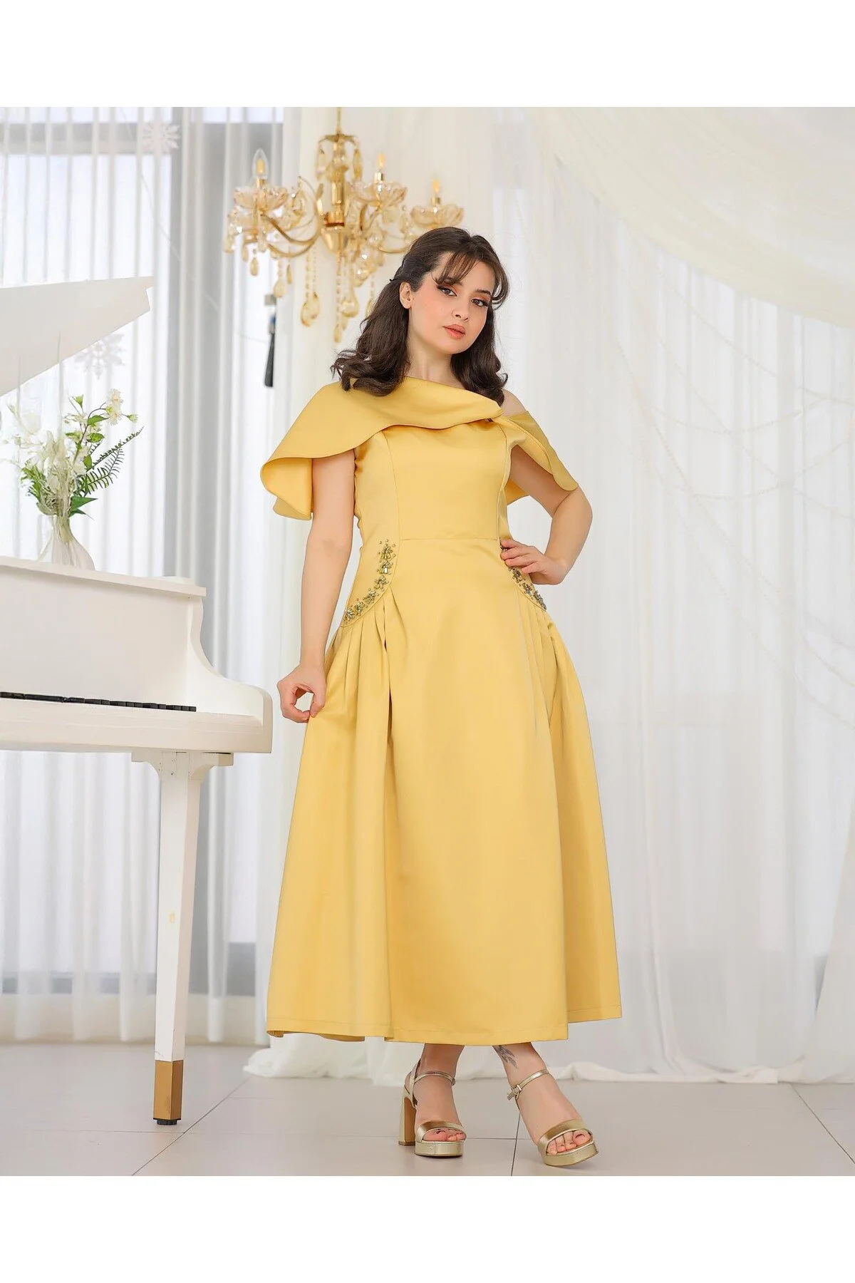 فستان سهرة ميدي نسائي ساتان ضيق بياقة V وأكمام منفوشة - Beyond Store