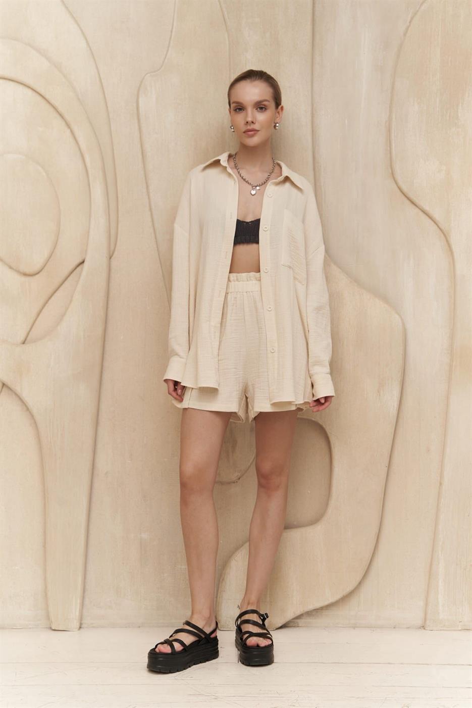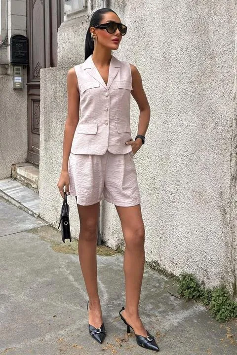 طقم فيست منقوش مع تفاصيل جيوب وشورت متناسق يمنحك لمسة عصرية وحيوية مع راحة تامة، مثالي لأيام الصيف والطلعات العفوية.