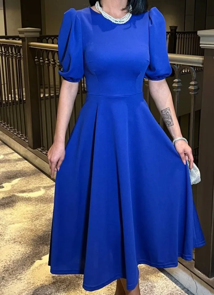 فستان ميدي مخرم بياقة مربعة وتفصيلة إبزيم. تصميم ناعم مثالي للتنسيقات الخفيفة والإطلالات الصيفية الراقية للنساء.