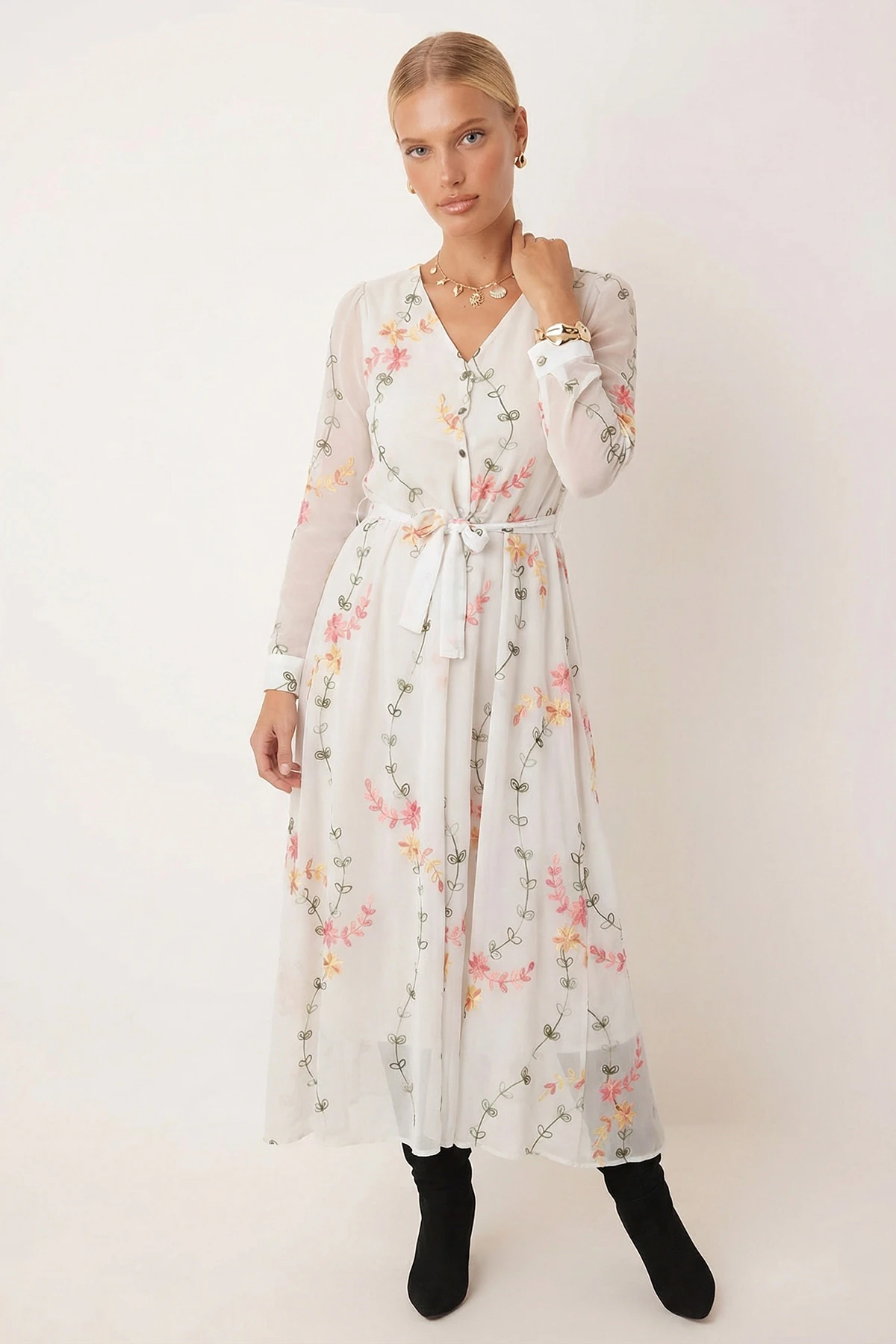 قماش تول منقوش يمنح هذا الفستان المتوسط الطول طابعًا أنثويًا ناعمًا، مثالي لحفلات الحديقة أو المناسبات الخاصة أو كل يوم تبحثين فيه عن إطلالة أنيقة وبسيطة.