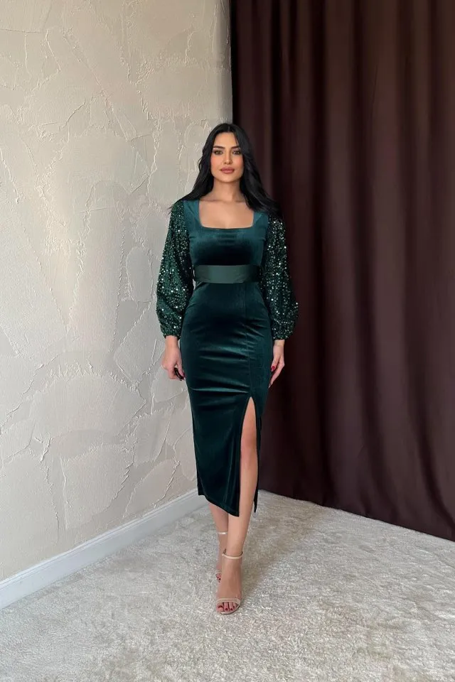 فستان سهرة ميني ضيق بياقة قلب وأكمام منفوشة وفتحة جانبية للنساء