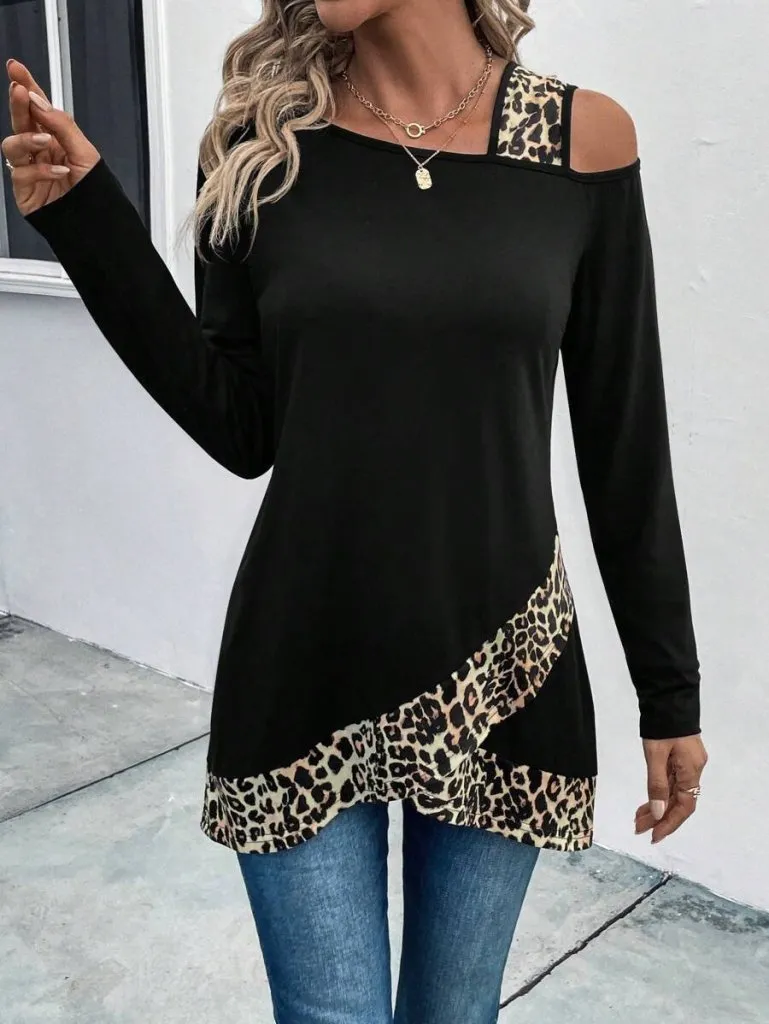 بلوزة بنقشة ليوبارد صغيرة بياقة V وأكمام واسعة بكسرات. قصة منسدلة تناسب أيام التنقل والراحة.