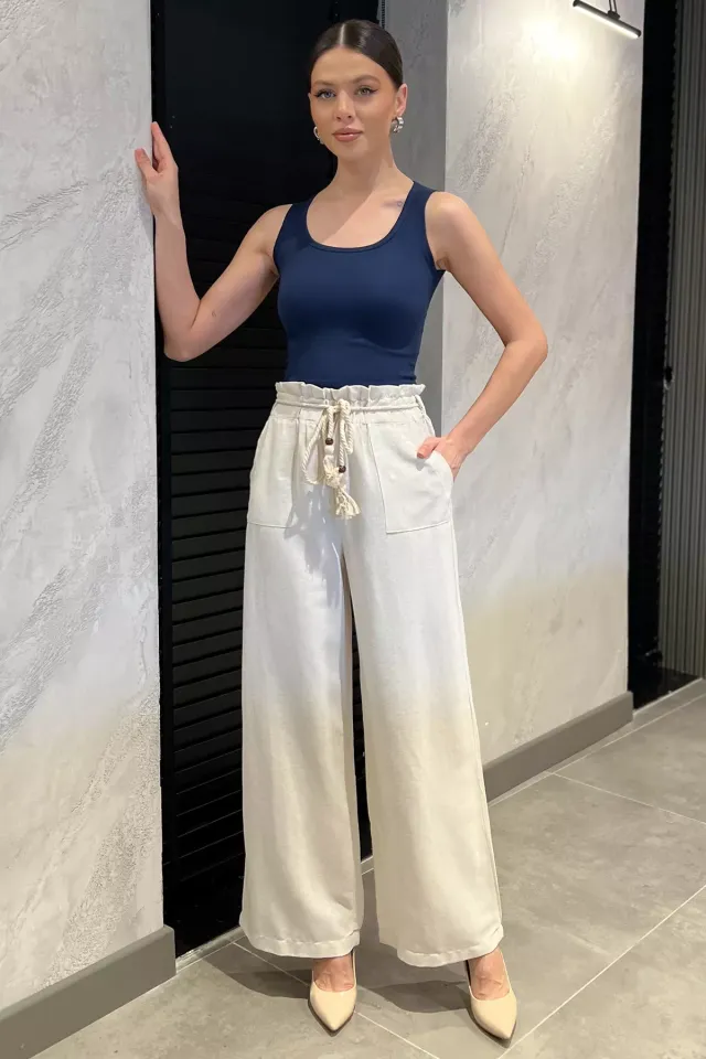 بنطلون نسائي بخصر مرتفع وكسرات أمامية وقصة موم فيت. عملي ومريح لإطلالاتك اليومية.