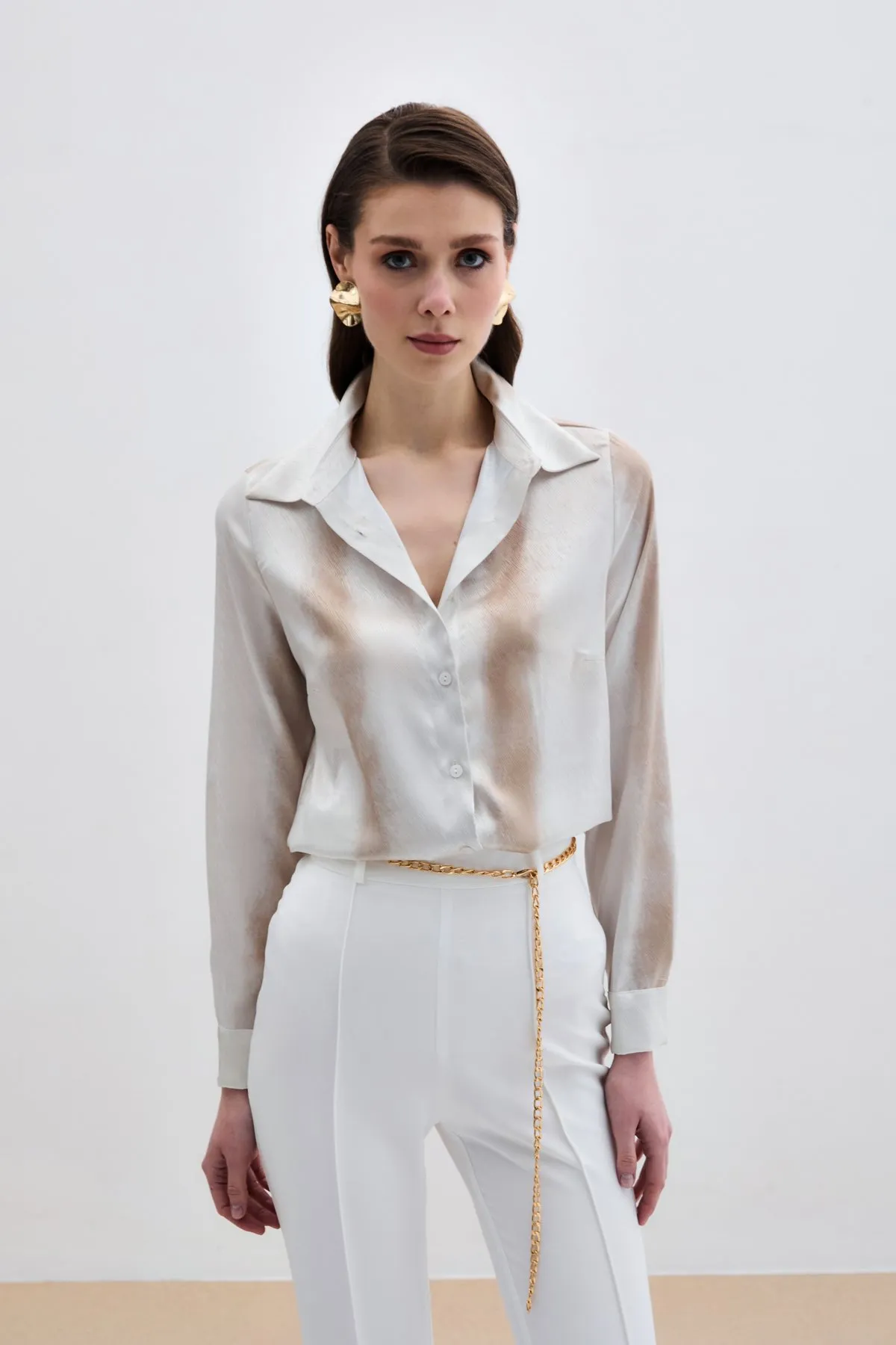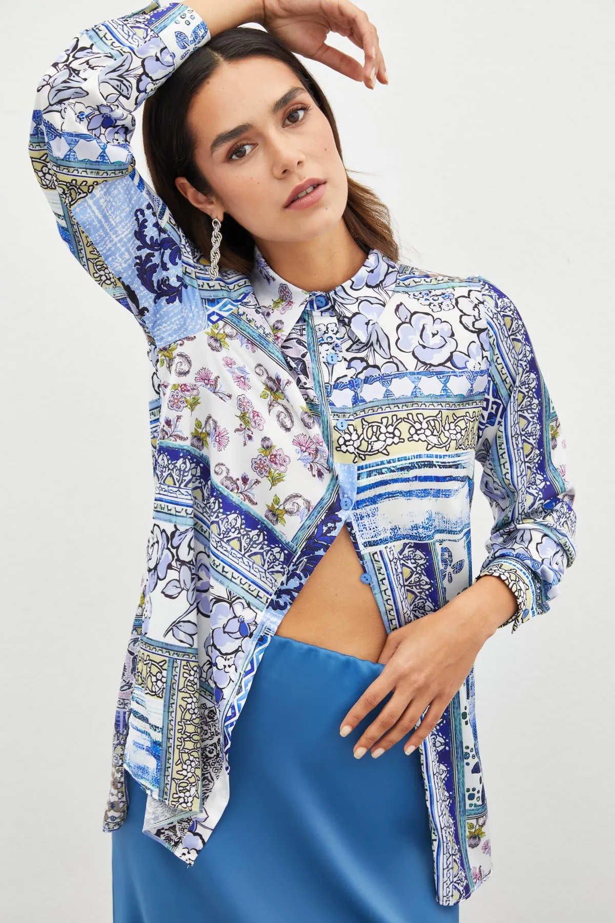 قميص سادة بأكمام خفاش بطول ثلاثة أرباع وأزرار أمامية للإغلاق. مصنوع من قماش ناعم ومسامي. قصة مريحة، مثالية للارتداء الكاجوال في الأجواء الحارة.