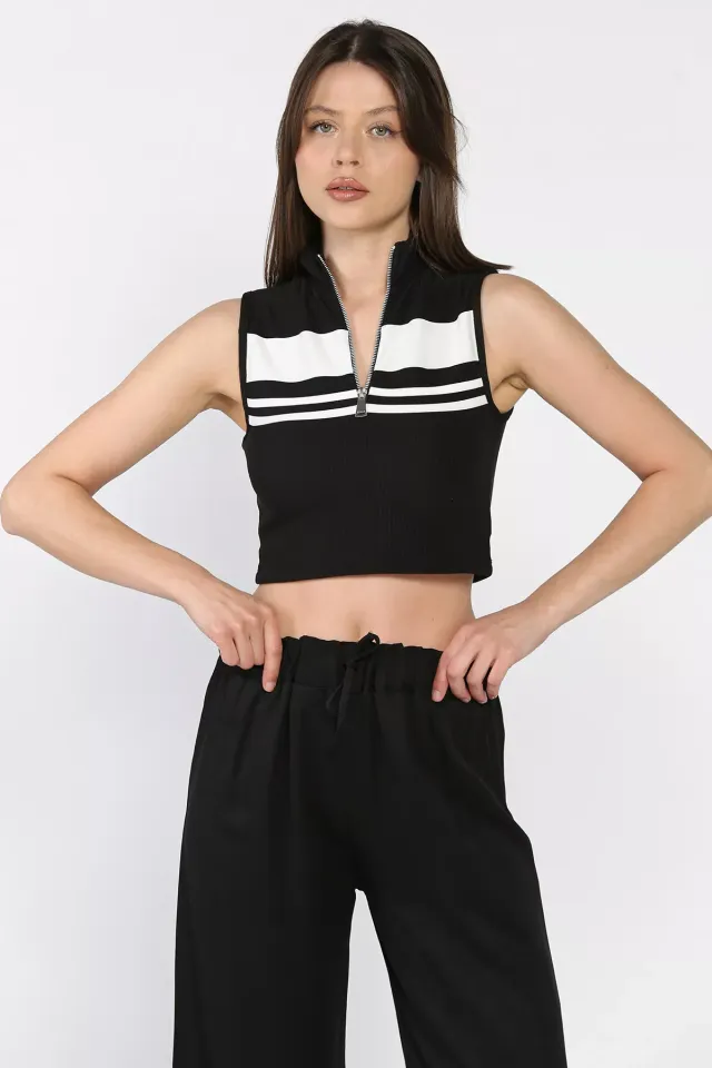 سويت شيرت قصير مزين بتفاصيل لونين وياقة بولو وأكمام طويلة للنساء