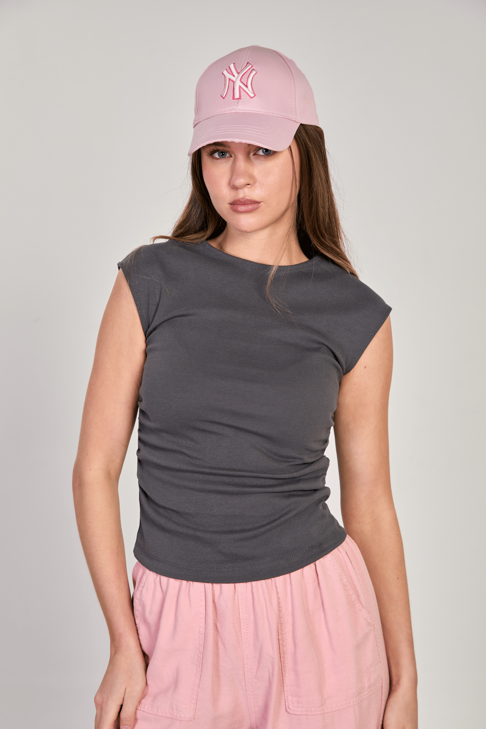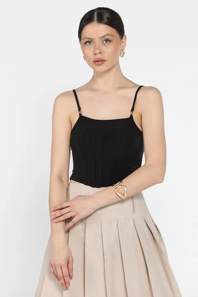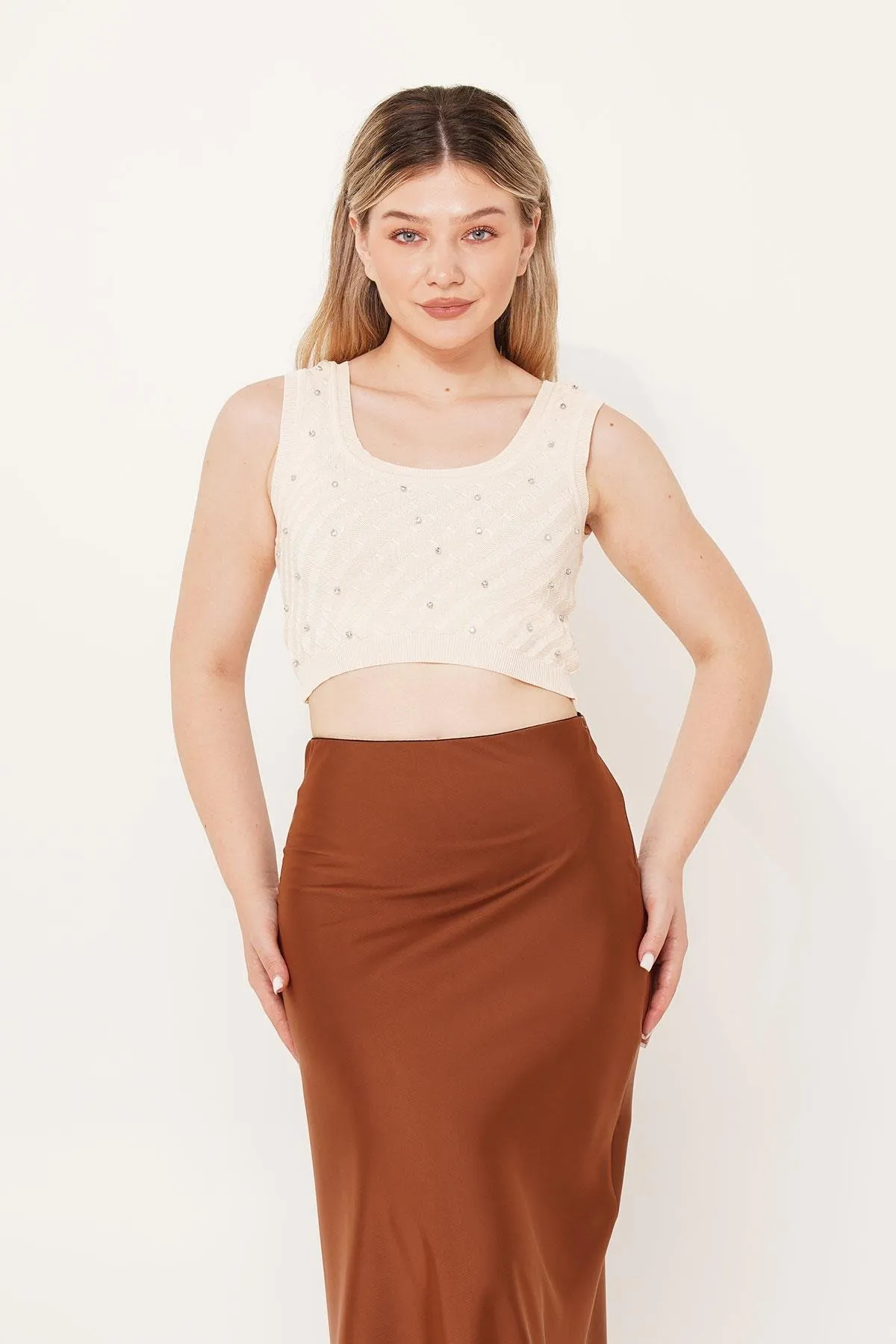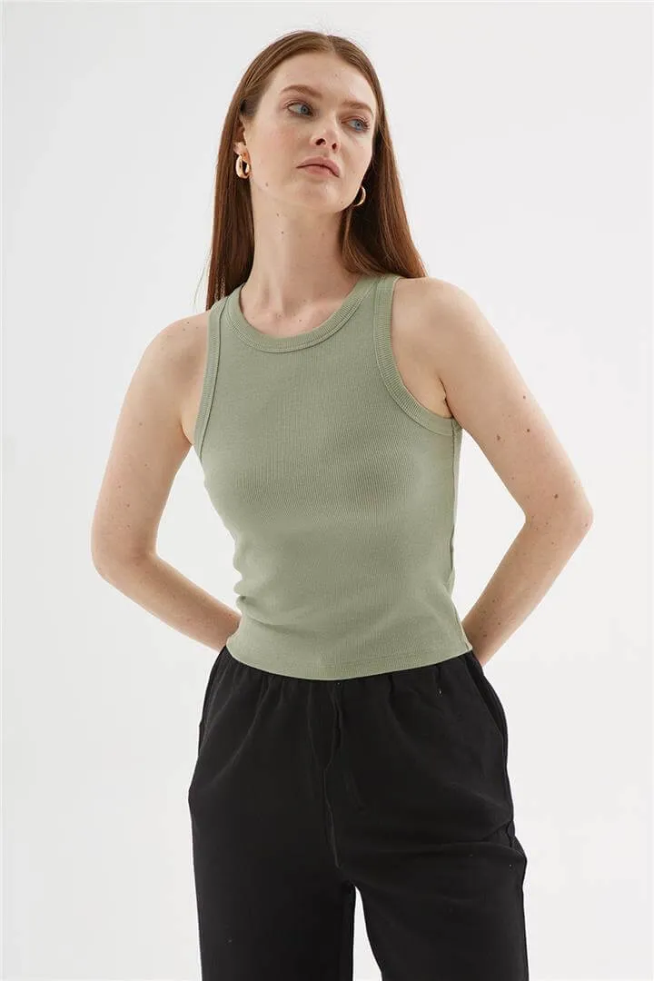 توب قصير بياقة مستديرة وأكمام طويلة. تصميم ضيق مثالي للاطلالات الصيفية اليومية.
