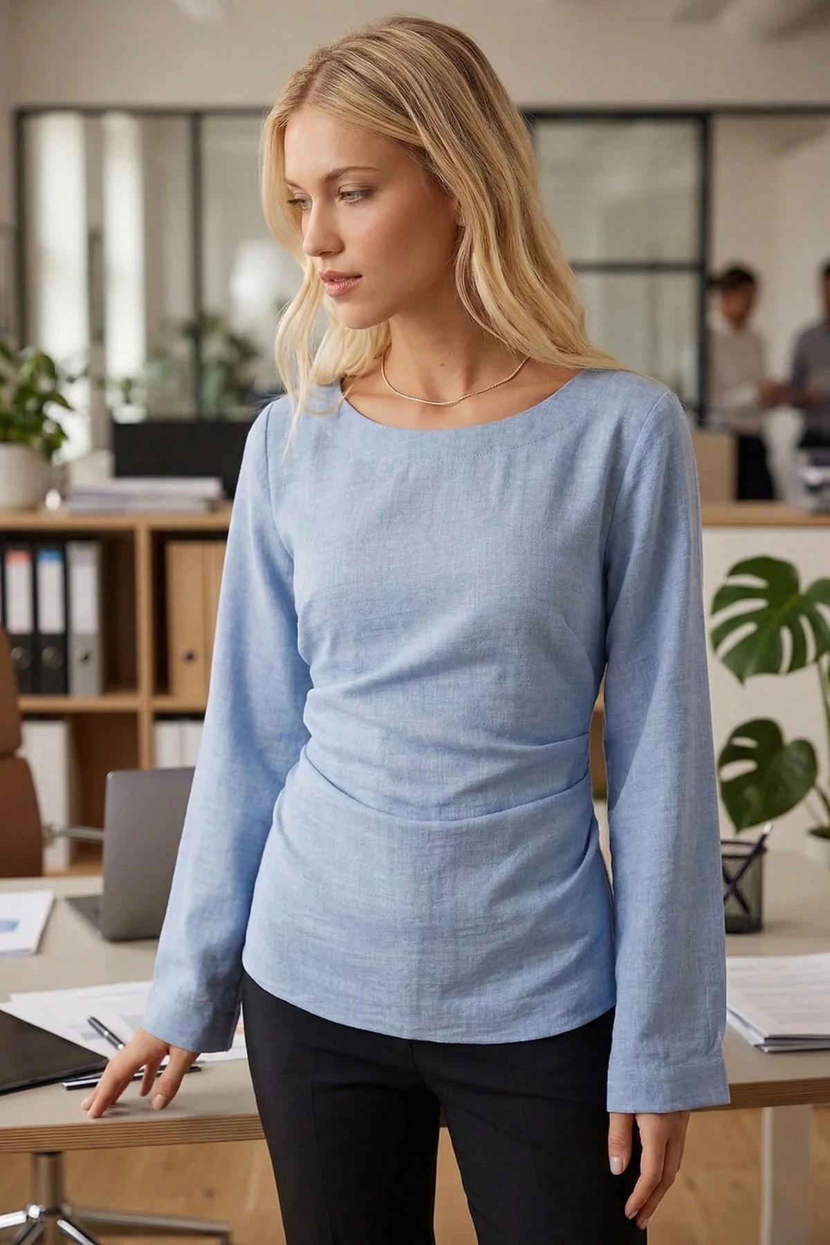 بلوزة محبوكة بياقة قارب واكمام طويلة، مصممة لاطلالات صيفية يومية تبرز القوام للنساء.