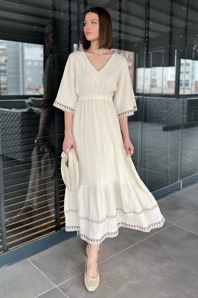 فستان ميدي بحمالات وياقة V بقصة A خفيفة، تصميم انسيابي مثالي لأيام الصيف المنعشة للنساء