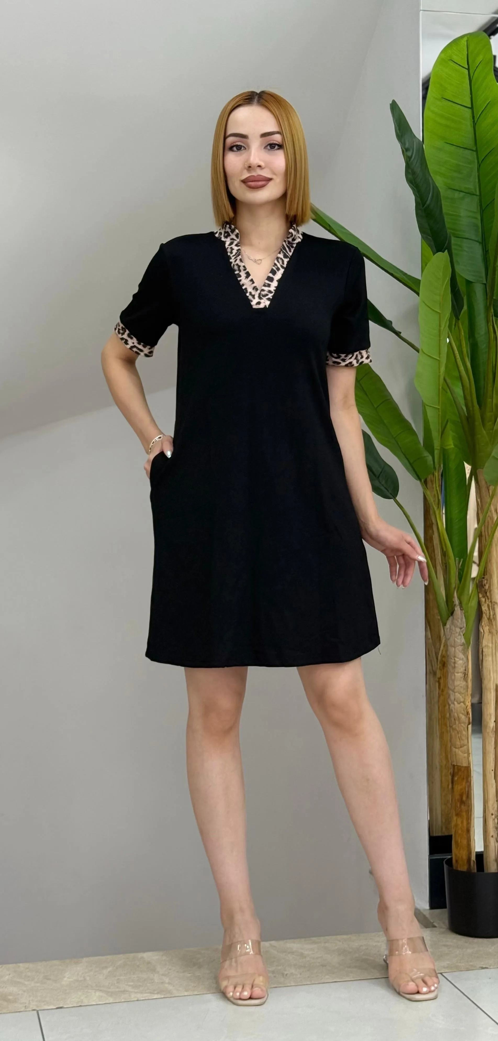 فستان ميدي بطبعة جلد نمر وياقة غير متناظرة وتفاصيل مكشوفة بحمالات وطيات ناعمة، مزيج جريء من النقشات لإطلالة صيفية واثقة.