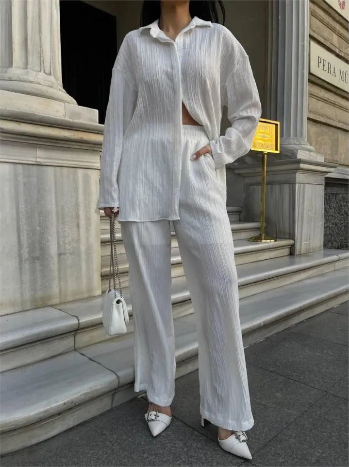 طقم كيمونو وبنطلون بأكمام طويلة للنساء، مصنوع من قماش ناعم قابل للتنفس لتوفير الراحة اليومية والمناسبات غير الرسمية الأنيقة.