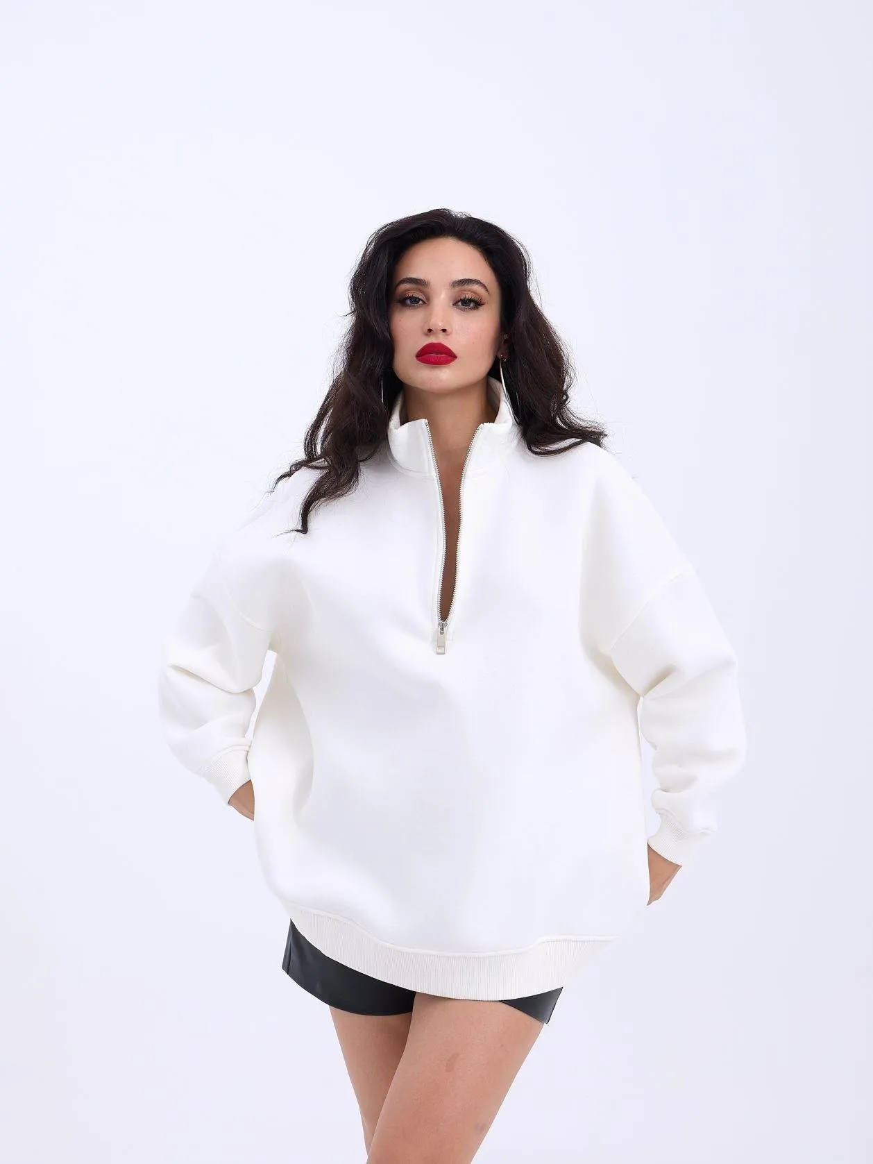 سويت شيرت سادة كبير الحجم بياقة قائمة وأكتاف منسدلة للنساء - Beyond Store