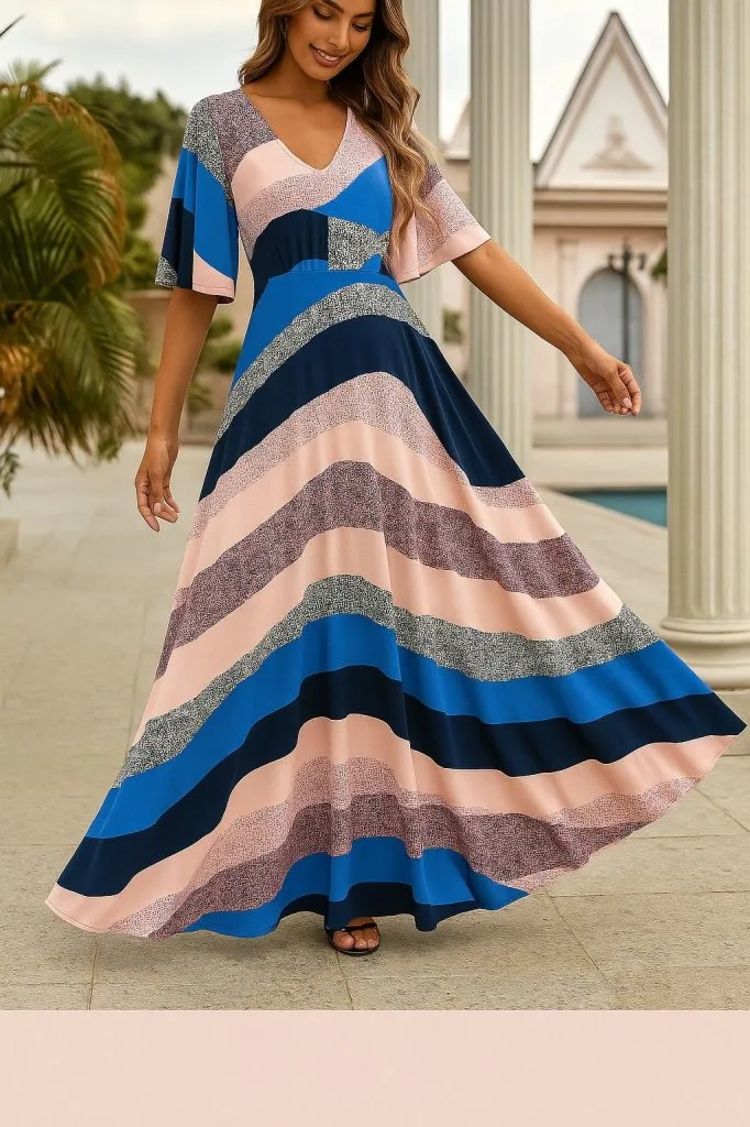فستان ماكسي بطبقات وياقة V وأكمام منفوخة، تصميم يجمع بين الرقي والحيوية ليمنحك حضوراً مميزاً في السهرات، حفلات الحديقة، أو أي مناسبة خاصة تتطلعين فيها لأناقة لا تضاهى.