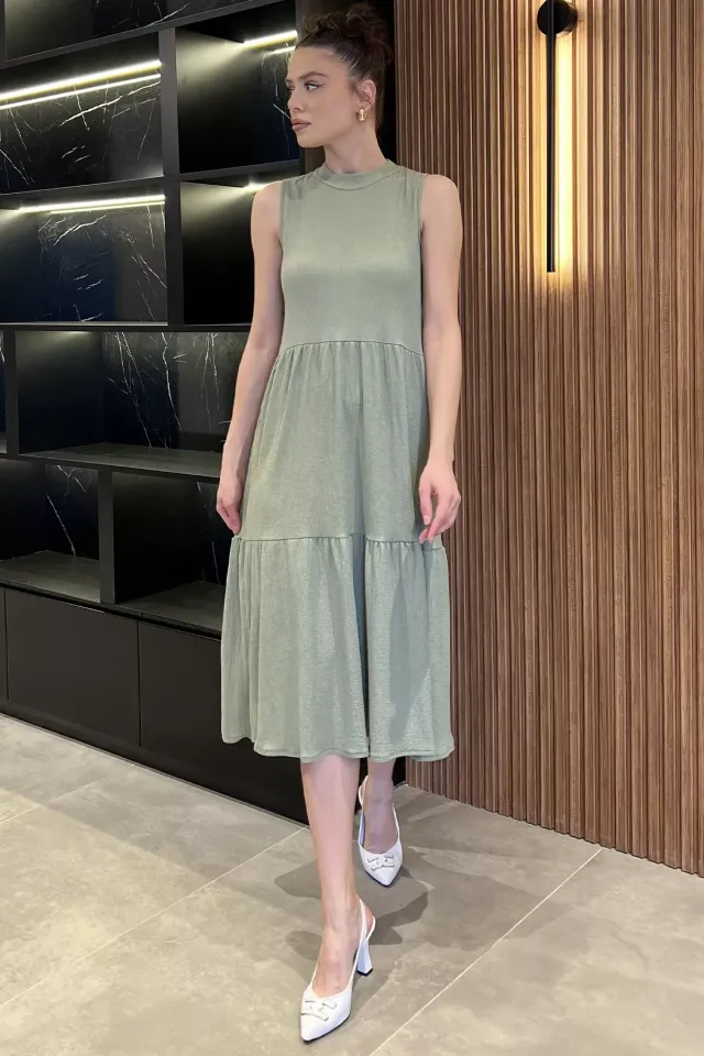 فستان ميدي منقوش بأكمام منفوخة وياقة مكشوفة للنساء