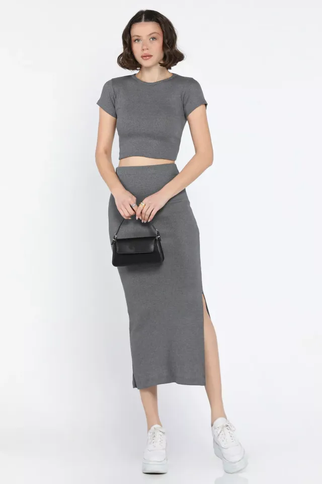 طقم سويتر أكريليك بأكمام طويلة وتنورة بشق جانبي. مريح ودافئ، مثالي لإطلالات أنيقة وعملية.