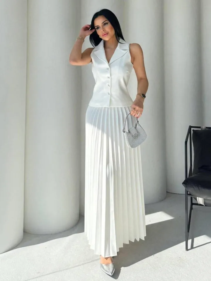 طقم بلوزة بأكمام طويلة وفتحة رقبة على شكل حرف V وتنورة بفتحة. ناعم ومريح، مثالي لإطلالاتكِ اليومية الكاجوال.
