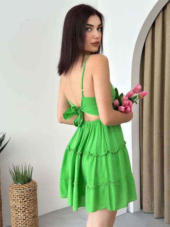 فستان قصير منقط بتوب مضلع وخصر برباط للنساء