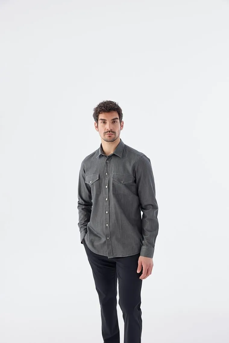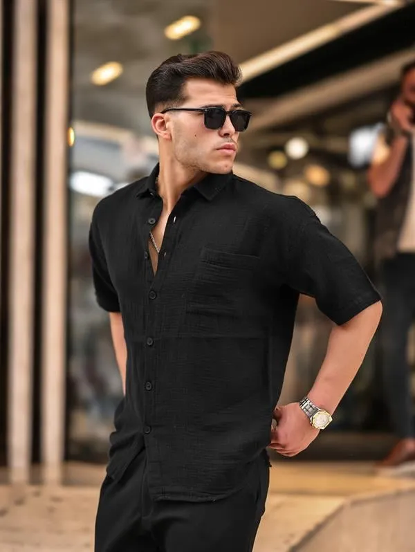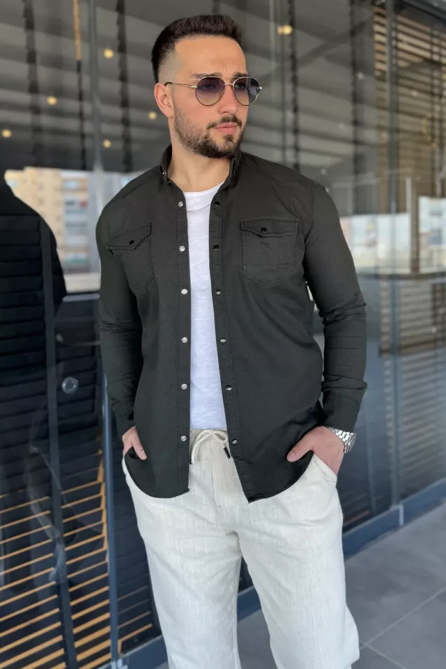 قميص رجالي بأكمام طويلة وياقة بأزرار، مصنوع من قطن خفيف الوزن ١٠٠٪ بتصميم كتان. يوفر التهوية والراحة، مثالي للارتداء اليومي غير الرسمي، قابل للغسل على درجة حرارة ٣٠ درجة مئوية.