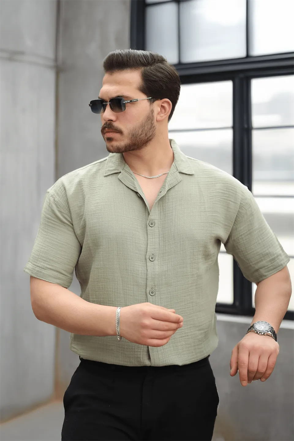 قميص رجالي مُجعّد بأكمام قصيرة وياقة مُطوية، مصنوع من قطن ١٠٠٪. خفيف الوزن وجيد التهوية، يُضفي مظهرًا أنيقًا ومُحكمًا، مثالي للطقس الدافئ. قابل للغسل في الغسالة على درجة حرارة ٣٠ درجة مئوية.