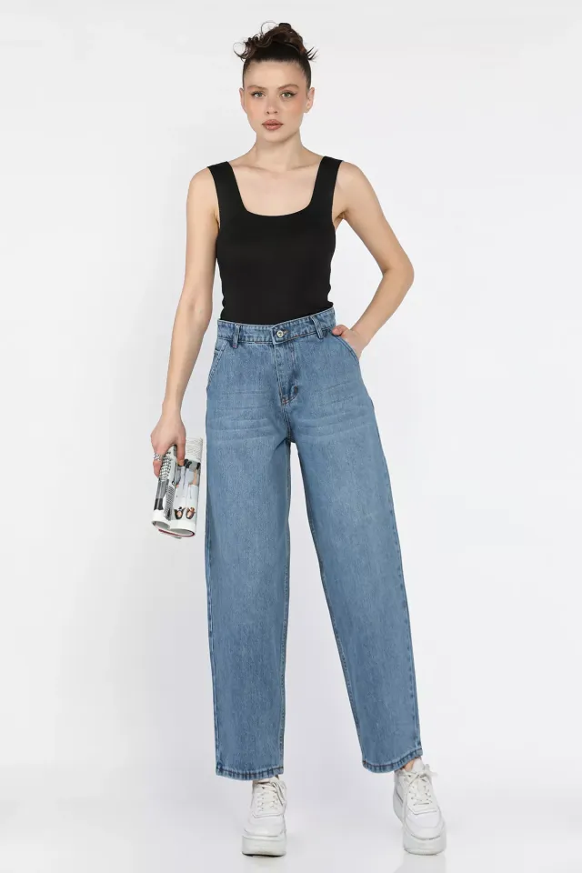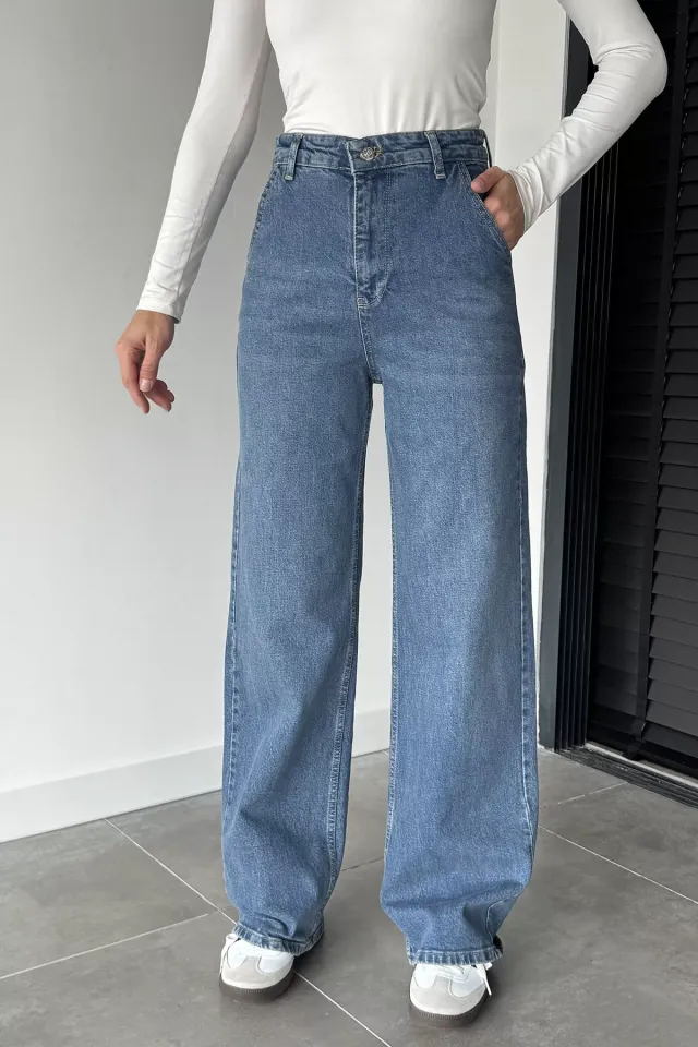 بنطلون جينز بخصر مطاطي وساق واسعة بقصة مستقيمة للنساء - Beyond Store