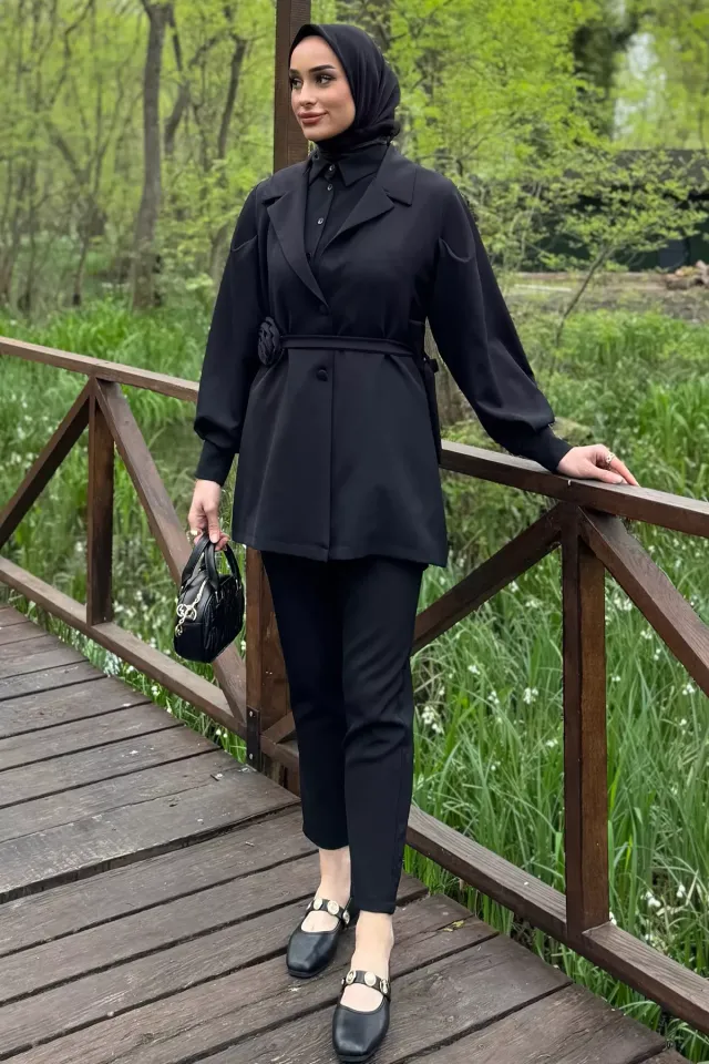 طقم تنورة مكون من قطعتين برقبة قميص وخصر مطاطي، تصميم محتشم يوفر راحة وأناقة كاجوال مع حركة سهلة، مناسب للاستخدام اليومي أو الطلعات المريحة.