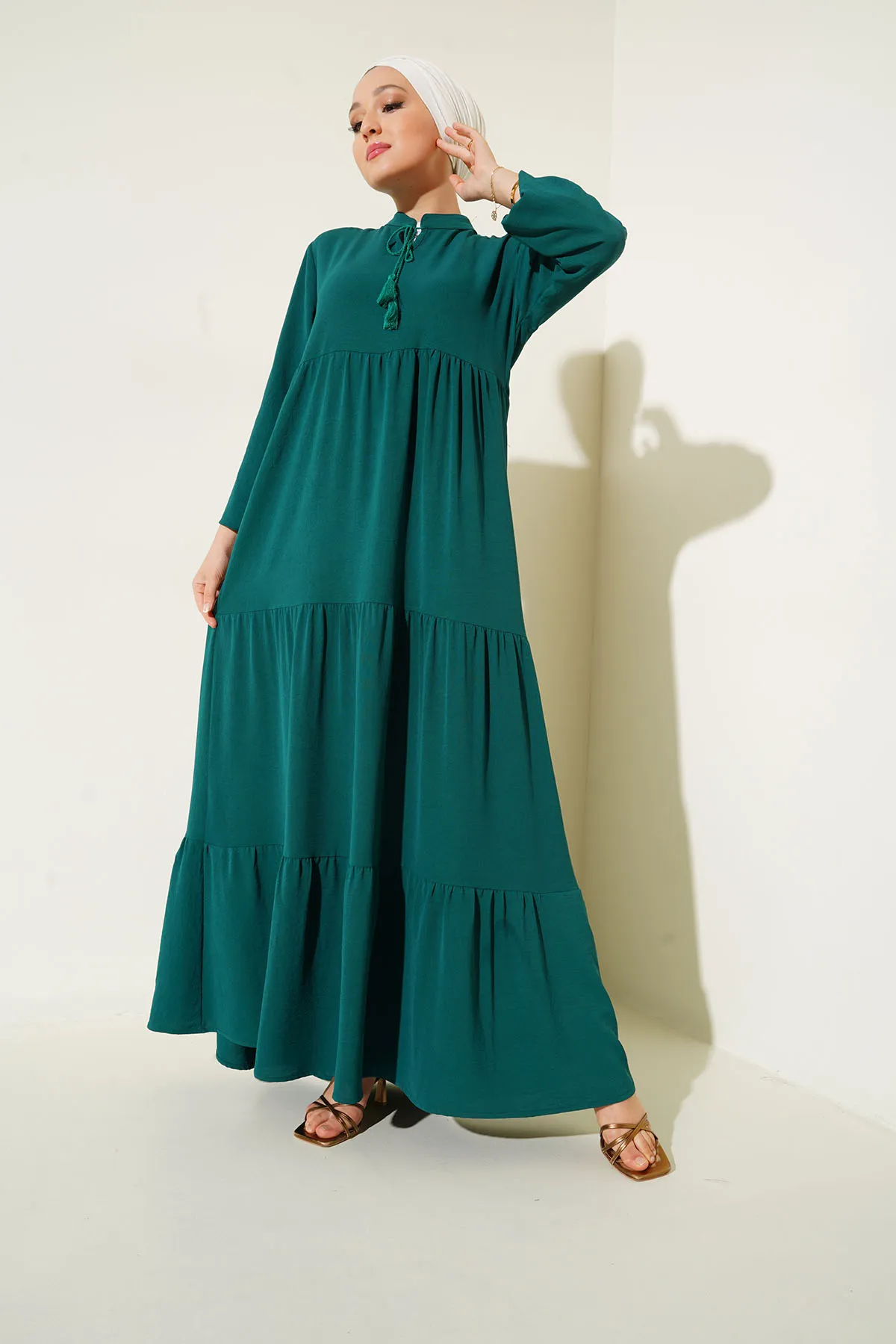 فستان طويل كلوش بنقشة وياقة نصف عالية مع أزرار أمامية للنساء