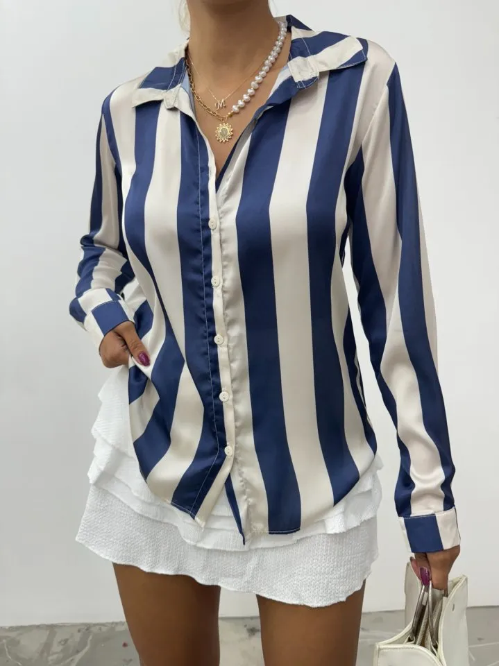 قميص نسائي مخطط بقصة مريحة ومزين بأحجار الراين يضفي لمسة براقة وأنيقة تناسب أوقات العمل أو الجلسات اليومية.