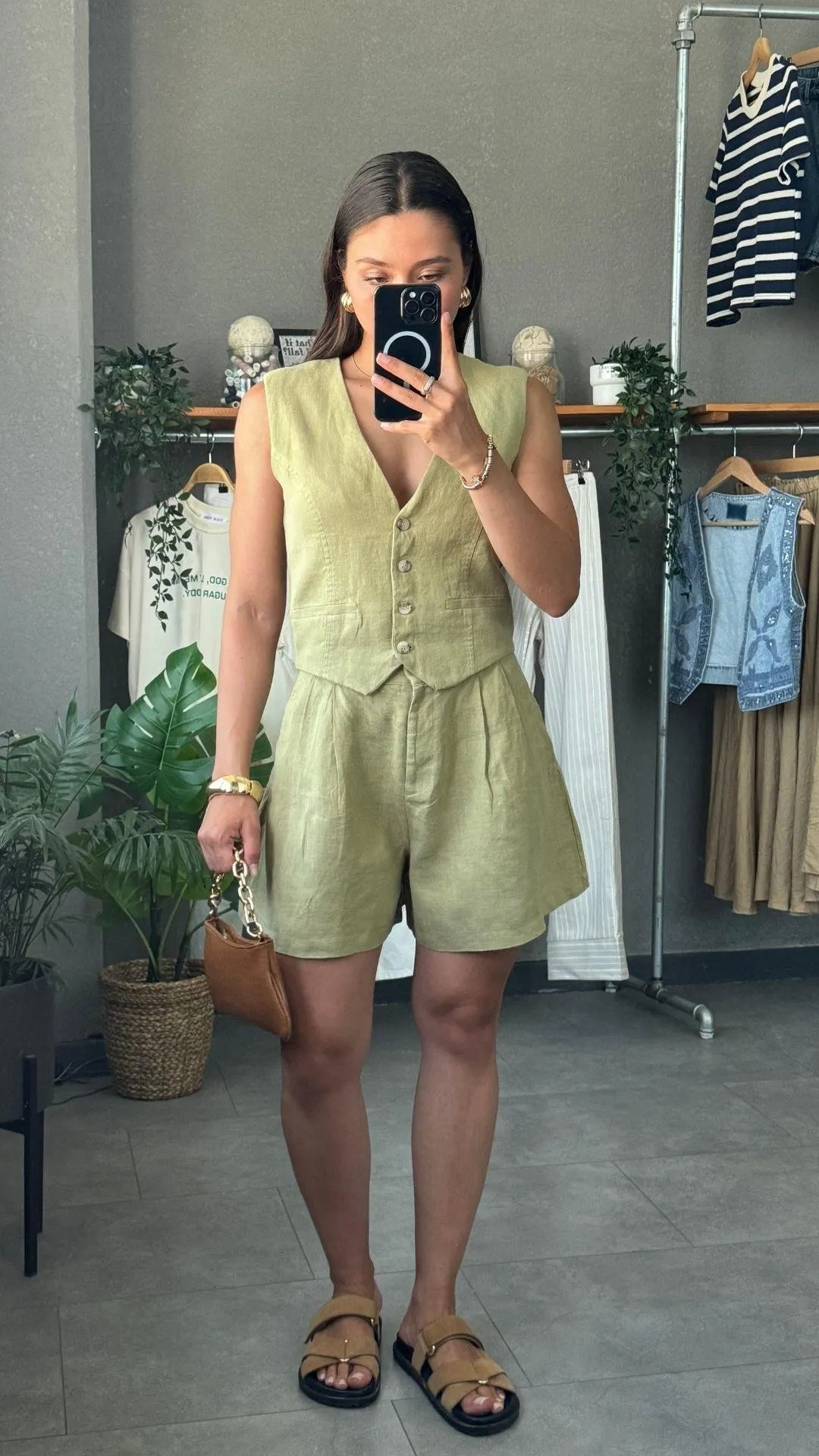 تصميم بطبقة أمامية بكسرات تمنح الشورت شكل تنورة. خيار أنيق ومريح للإطلالات اليومية في الجو الحار.